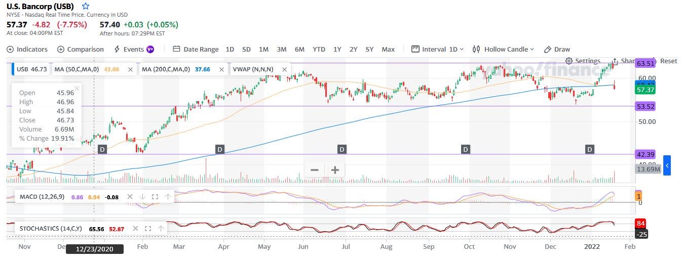 one day does not define life and neither will 1 quarter's marginal miss. Putting together strong earnings, a strong balance sheet and good cash flow, USB remains a sound investment. At the closing price of $57.37 (as per the end of 19 Jan 2022 trading day), it is considered "undervalued" with Intrinsic value at about $62+/-from the sources. This may be one of the few opportunities we use to invest in a good bank before the coming interest rates increase.