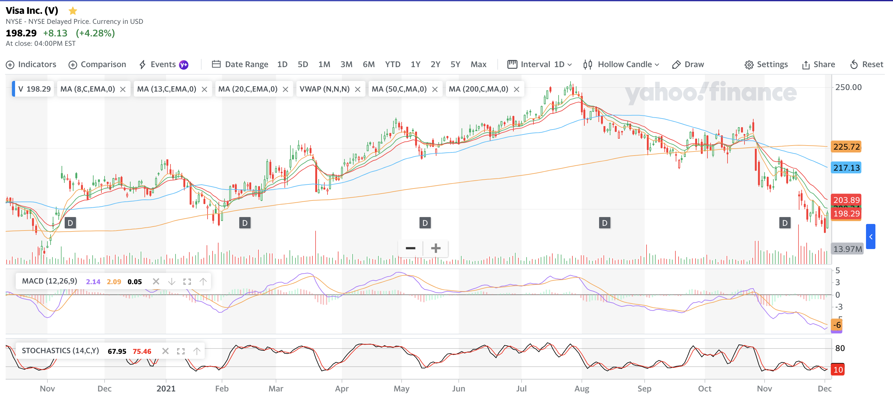 Using the 1 Day chart of VISA below, please note the period between November to December. From the Stochastic, we have several "false" signals to buy but the MACD indicator has much lesser "false" signals. After qualifying the business through analyzing their business fundamentals, this has become one of my main indicators when I take my positions using technical. In this case, I would wait for the 2 lines in MACD to cross (under the "0" line) > giving a buy signal before I would take up a position. However, MACD is also a lagging indicator and thus, we should include other strategies like price action into our technical approach to obtain the best confidence before we take up new positions.