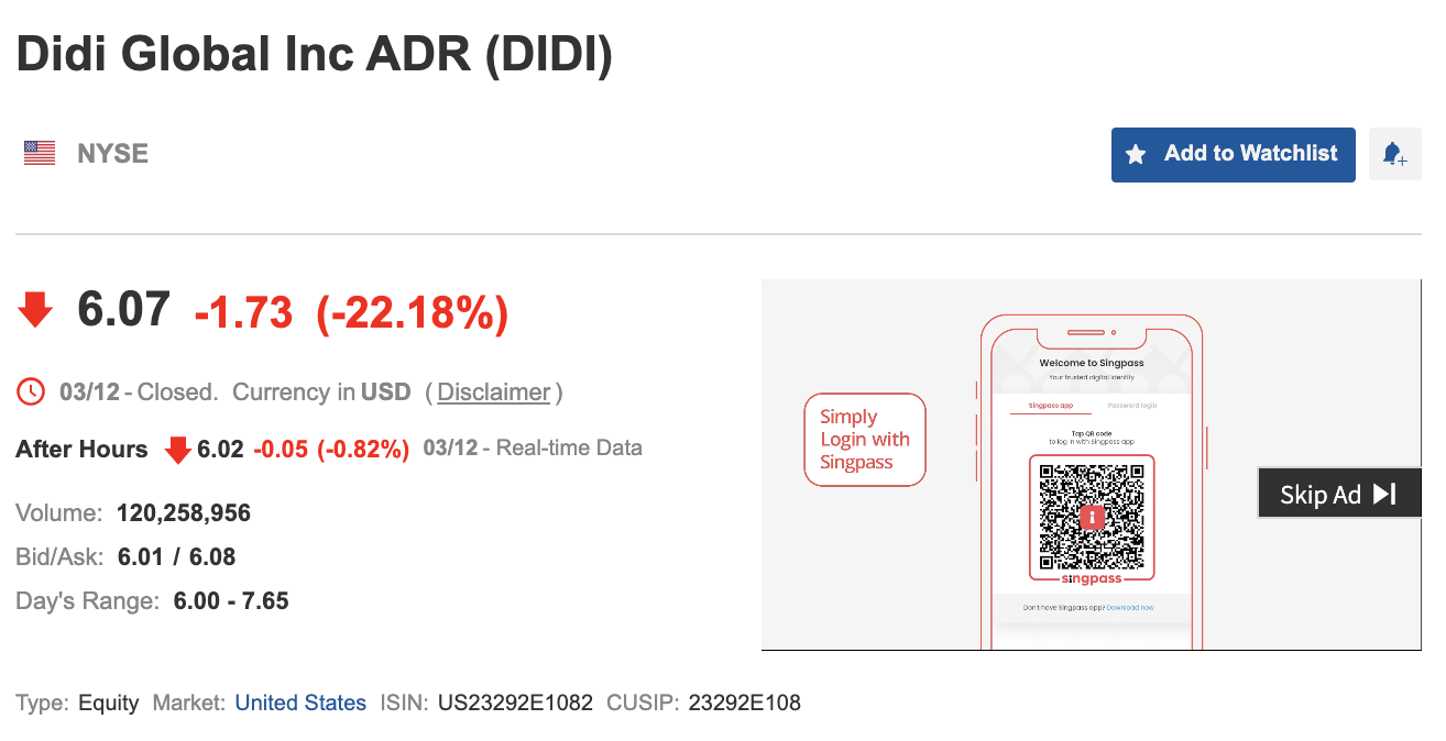 Screenshot from investing.com where you can find DIDI listed as ADR