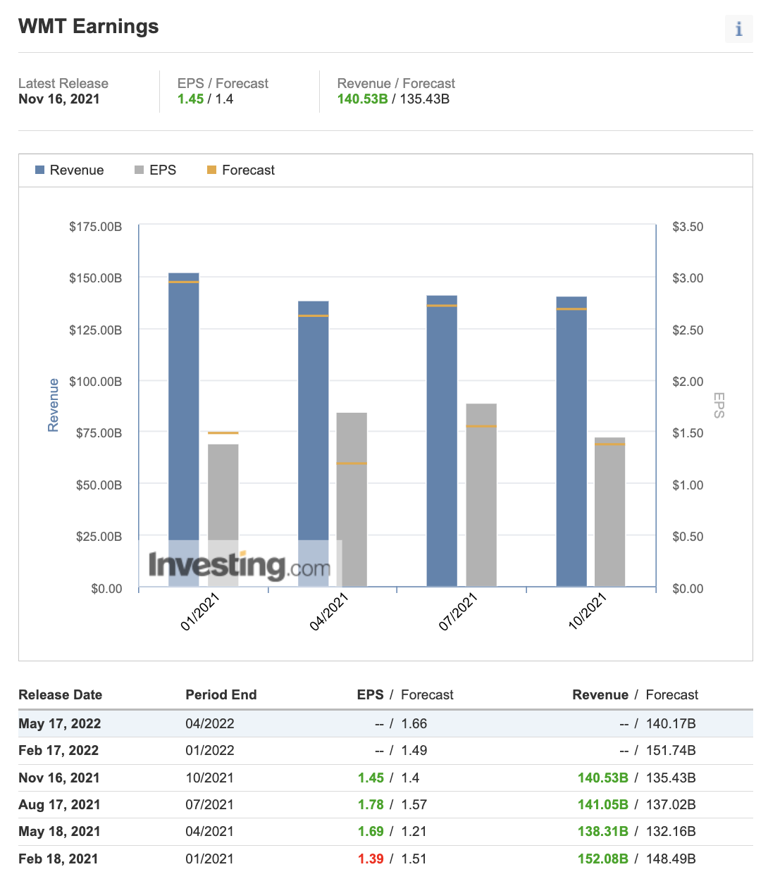 For the period ending 01/2022, the market is expecting Walmart to meet or beat $1.49 for EPS and $151.74B for revenue. Why would the price fall when both EPS and revenue beat the market? Assuming that the drop is not a market-wide fall, the 3rd component that affects the stock price after earnings is likely the guidance provided by the company. If the guidance is weak, the price may not rise despite beating both EPS and revenue in the quarterly earnings. If guidance is bullish, the price may rise even if one of the components (revenue or EPS) fail to beat the forecast. We will usually find the guidance in the Earnings Report itself. There are also other components that will affect the outlook of the business: daily users, monthly users, new subscriptions, delay in key product development (eg Tesla pushing back the rollout of the $25K car), investment loss (in subsidiaries), failure to buy over another business, etc. All these form part of the market sentiment towards the stock.