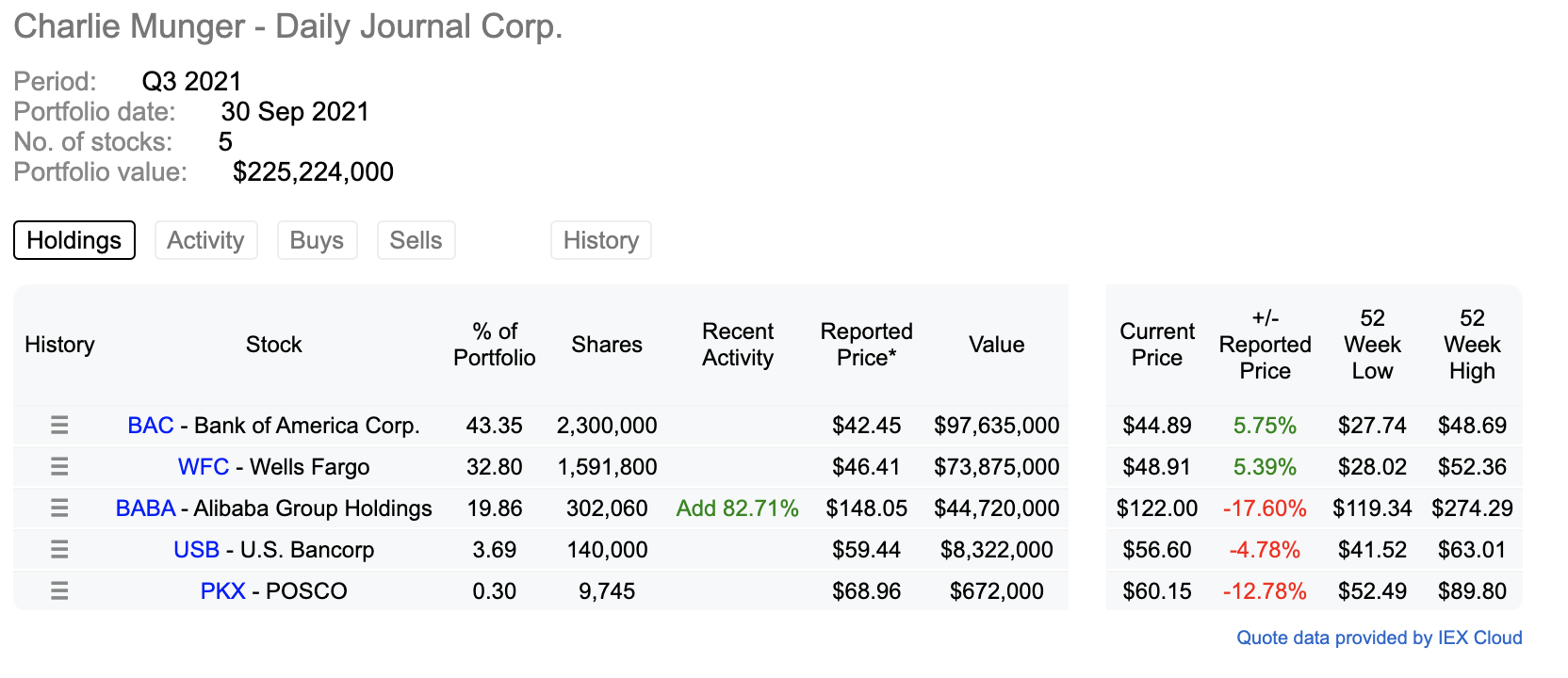 After selecting the super investor, we will be brought to the screen above that shows the last quarterly holdings (as per 30 Sep 2021 in this case of Charlie Munger, Daily Journal Corp). We can see that Mr Munger added 82.7% of $BABA to his portfolio with the “reported” price to be $148.05. This is an estimated price as on the last closing price of the quarter and not necessarily the price paid for his position.