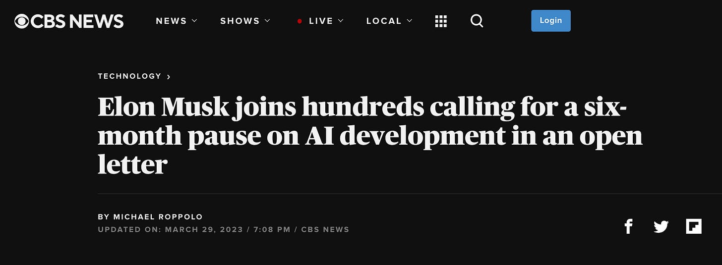 There is a news article calling for a 6-month pause on AI development. There is a call from various business leaders including Elon Musk on the development of AI. Elon Musk was one of the early investors of OpenAI (ChatGPT).