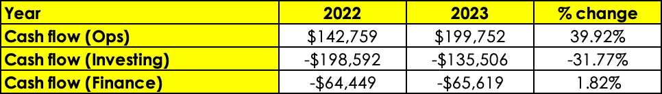 Observations from cashflow (for the year ended 31 Mar, between 2022 & 2023):