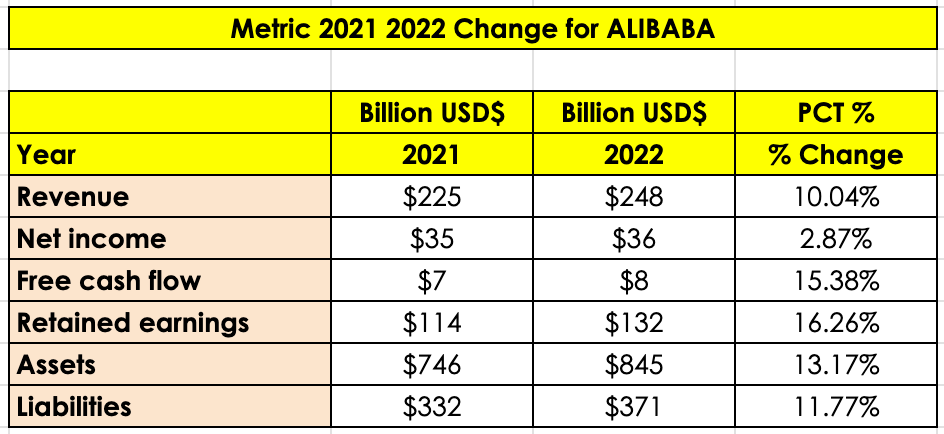 In 2022, Alibaba's revenue grew by 10% to $247.8 billion. Net income grew by 2% to $35.9 billion. Free cash flow grew by 16% to $7.5 billion. Retained earnings grew by 18% to $132.3 billion. Assets grew by 14% to $844.5 billion. Liabilities grew by 13% to $371.3 billion.