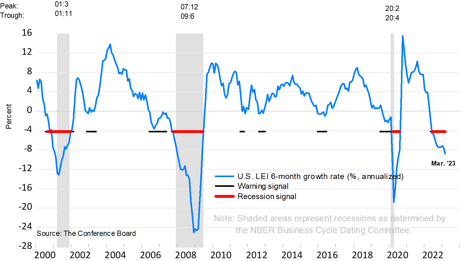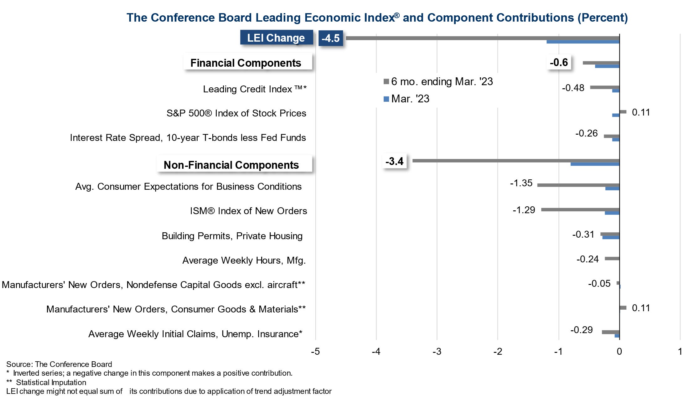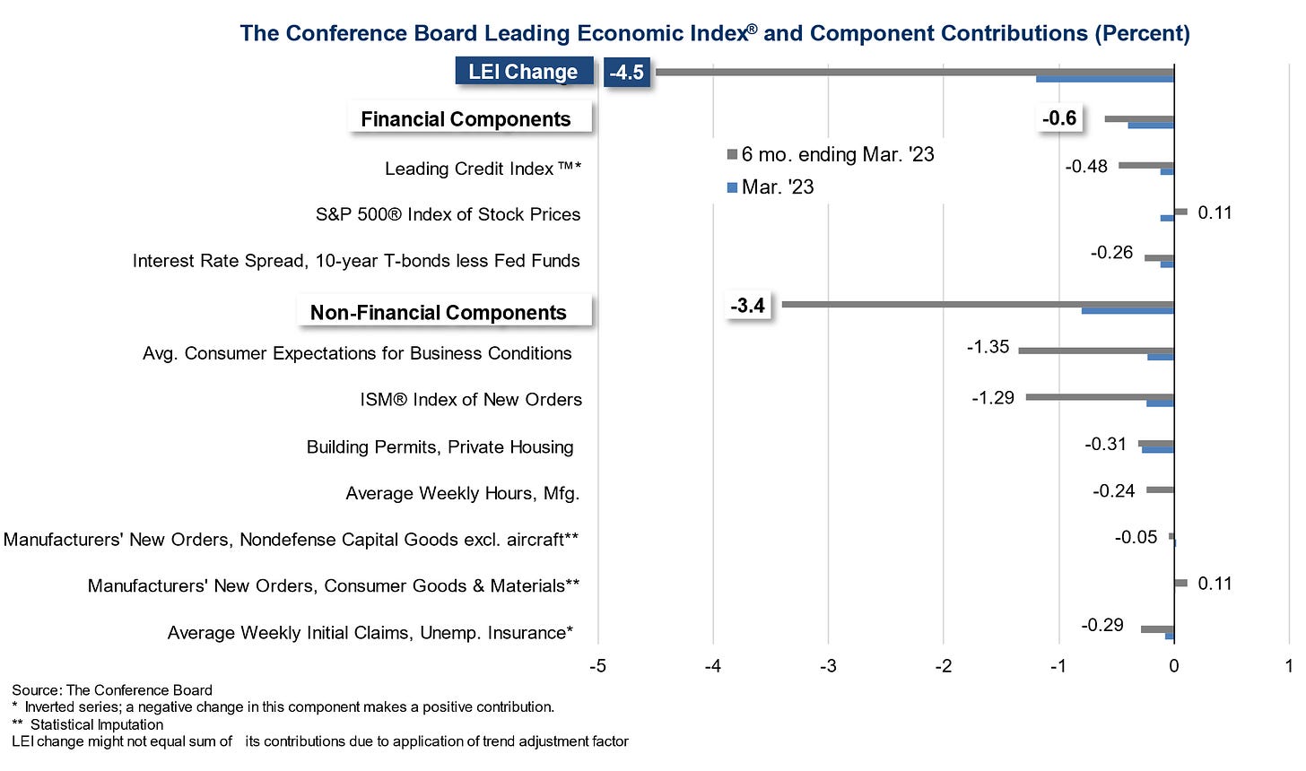 The Conference Board Leading Economic Index® (LEI) for the U.S. fell by 1.2 percent in March 2023 to 108.4 (2016=100), following a decline of 0.5 percent in February. The LEI is down 4.5 percent over the six-month period between September 2022 and March 2023—a steeper rate of decline than its 3.5 percent contraction over the previous six months (March–September 2022).