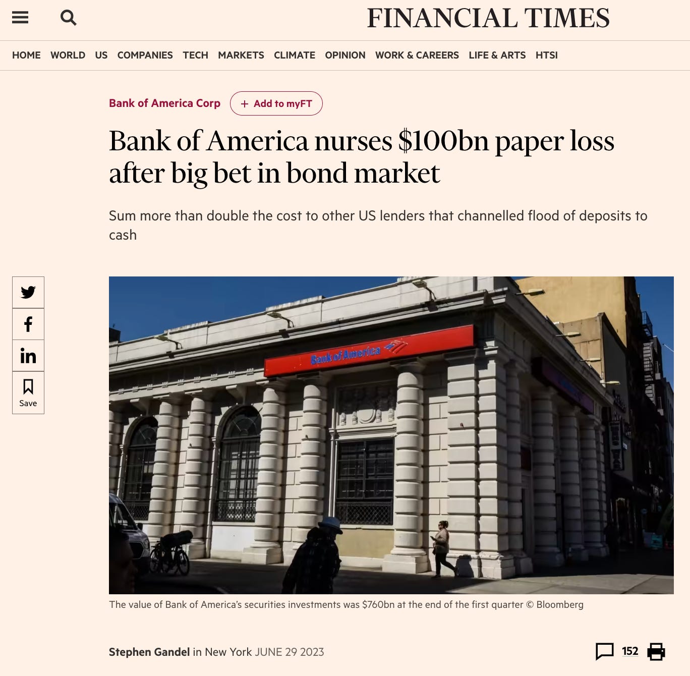 The moves left BofA, the second-largest US bank by assets, with more than $100bn in paper losses at the end of the first quarter, according to data from the Federal Deposit Insurance Corporation. The sum far exceeds unrealised bond market losses reported by its largest peers.