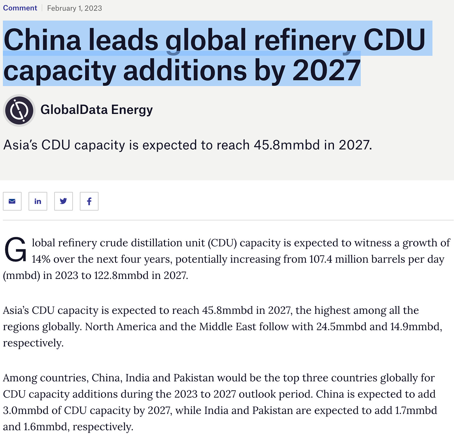 On top of this, China has been expanding their refinery capacity with more refineries being built and current ones expanded.