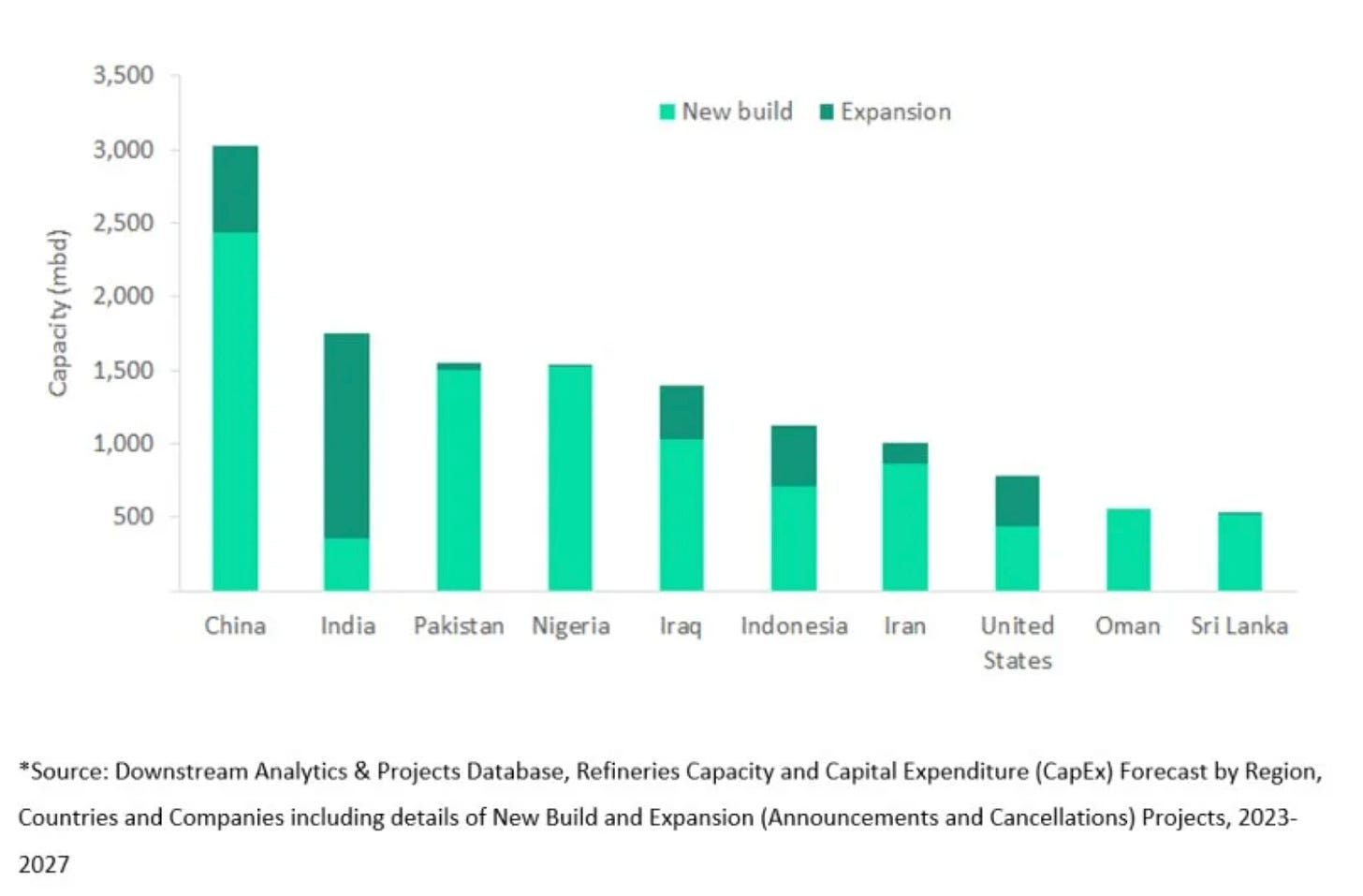 From the chart above, China will have the most CDU growth between 2023 to 2027 through new builds and expansion of current refineries. From this list, the sole representation from the West is the United States.