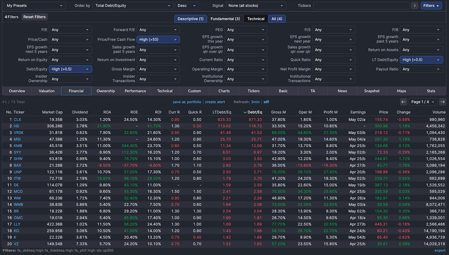 Thus, I have started to research and the above is the list of companies sorted by the main filter of Debt/Equity ratio. Clorox, Home Depot & Baxter caught my attention. Baxter has a high Debt/equity ratio and is in the red (net income loss), with negative ROA, ROE and ROI.