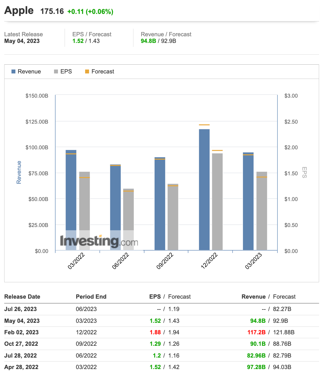 For the latest earnings (period ending 03/2023) release dated 04 May 2023, the forecast is 1.43 and 92.9B for its EPS and revenue respectively. Apple has beaten EPS & revenue estimates with actual results of 1.52 and 94.8B for EPS & revenue respectively.