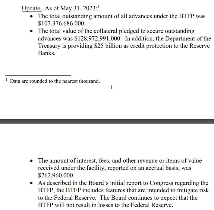 As of 31 May 2023, the total outstanding amount of all advances under the Bank Term Funding Program (BTFP) was $107,376,686,000. As of 30 April 2023, the total outstanding amount of all advances under the BTFP was $83,061,693,000. The increase is $24.3B.