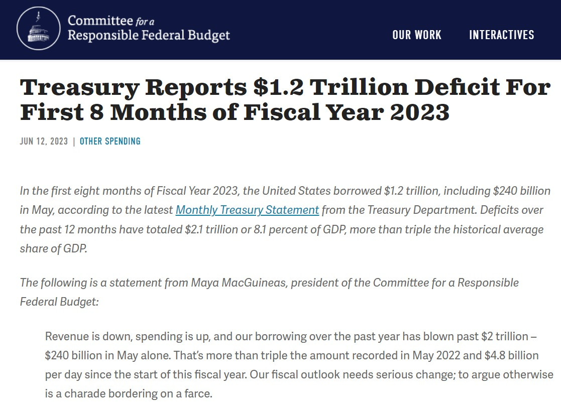 We are at $1.2T (of Federal Deficit) in the first 8 months of Fiscal Year 2023 and borrowing over the past year is over $2T. At the recent 5% interest rate, $2T of borrowing alone is translated to an estimated $100B per year in interest payment alone.