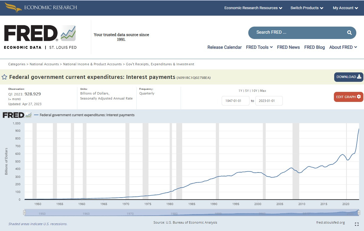 As of 27 Apr 2023 (before the rise of the debt ceiling), the amount that the US pays as interest to service these debts reached $928B. This amount paid to service US debts is already bigger than the entire US defence budget.