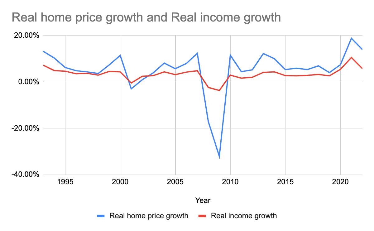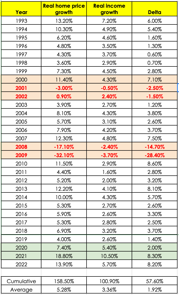 I have reached out to Google Bard to extract the real home price growth and real income growth for the last 30 years. This is what I have found. Note that we will be looking at real growth (that has included consideration of the current inflation).