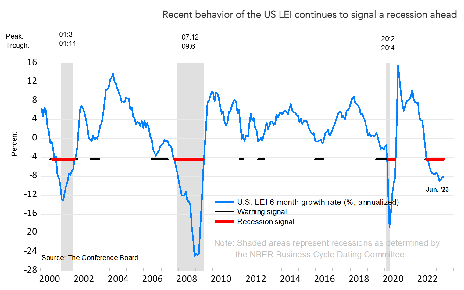The Conference Board Leading Economic Index® (LEI) for the U.S. declined by 0.7 percent in June 2023 to 106.1 (2016=100), following a decline of 0.6 percent in May. The LEI is down 4.2 percent over the six-month period between December 2022 and June 2023—a steeper rate of decline than its 3.8 percent contraction over the previous six months (June to December 2022).