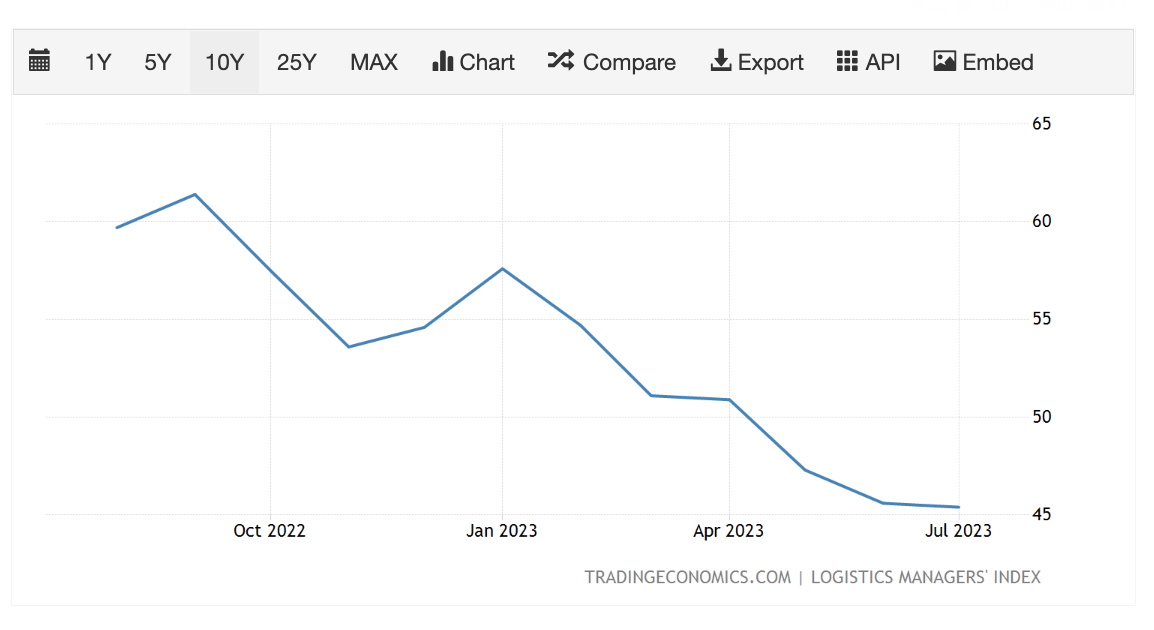 The Logistics Manager’s Index in the US fell to 45.4 in July 2023, marking not only a third consecutive month of contraction for the overall index, but also the fifth consecutive month it has reached a new all-time low. Inventory levels contracted at a record rate (-1 to 41.9), leading to lower growth for warehousing utilization (-4.3 to 52.5) and warehousing prices (-2.7 to 60.6), while warehousing capacity increased (+0.9 to 64.4). At the same time, growth for transportation capacity eased (-5.7 to 65.6) while transportation prices declined the least since April (2.8 to 35.6). "We continue to see very different outcomes for the overall economy and the logistics industry. This dichotomy is most clearly seen in employment figures. In the past we would expect to see transportation and warehousing ramping up hiring in late summer ahead of peak season. However, analysts do not see the same “urgency” towards hiring in the logistics industry so far this year", the LMI report showed. source: Logistics Managers' Index