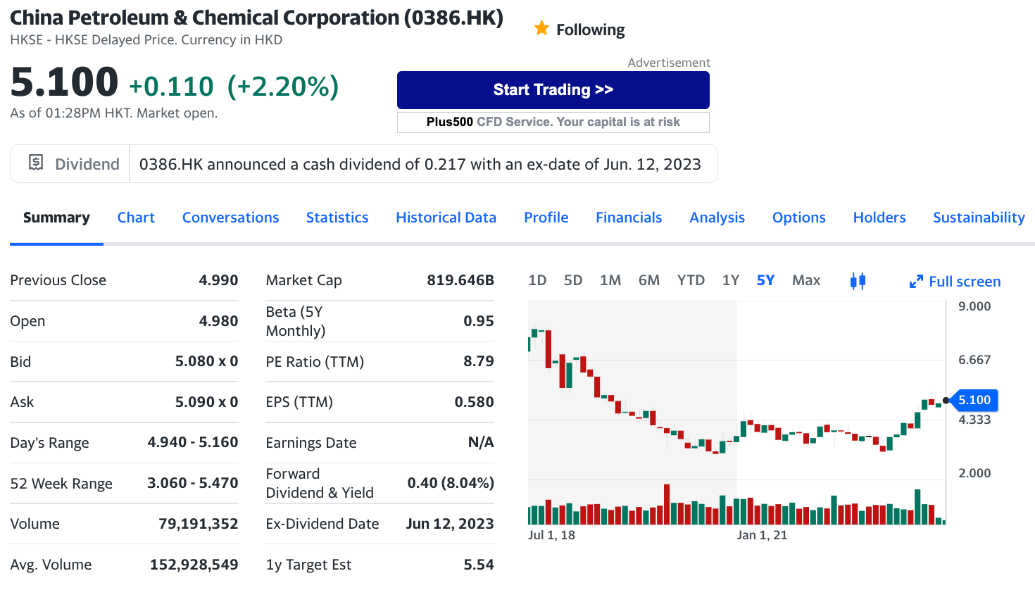 Overview of China Petroleum & Chemical Corporation (0386.HK) 08Jun2023
