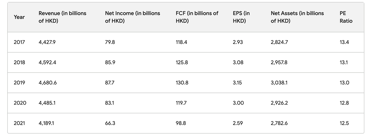 As you can see, the company's earnings have been declining over the past 5 years. In 2017, the company's earnings were 79.8 billion HKD. However, in 2021, the company's earnings had declined to 66.3 billion HKD. There are a number of factors that could be contributing to the company's declining earnings, including: