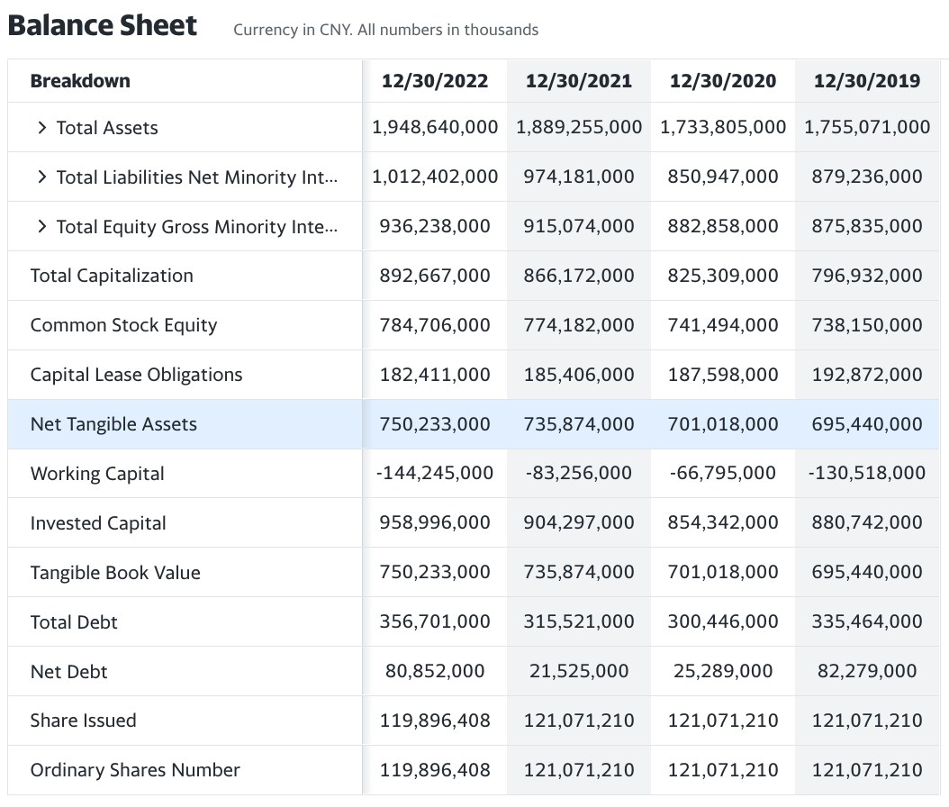 Both assets and liabilities have been increasing since 2019. Net debt fluctuates between CNY$82B to CNY$21B (2021). However, I am glad to see that the shares fell to 119,896,408 from 121,071,210 (2021).