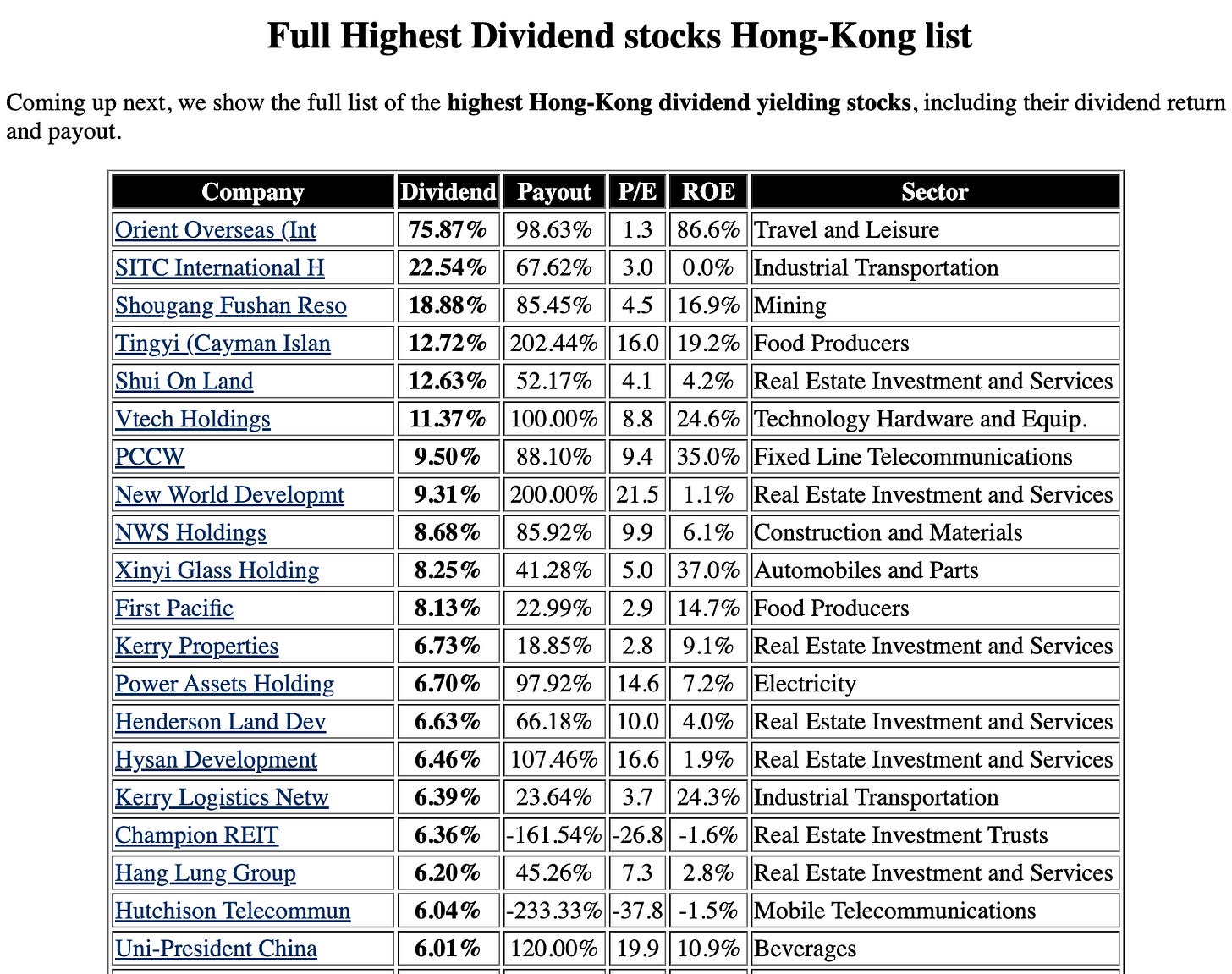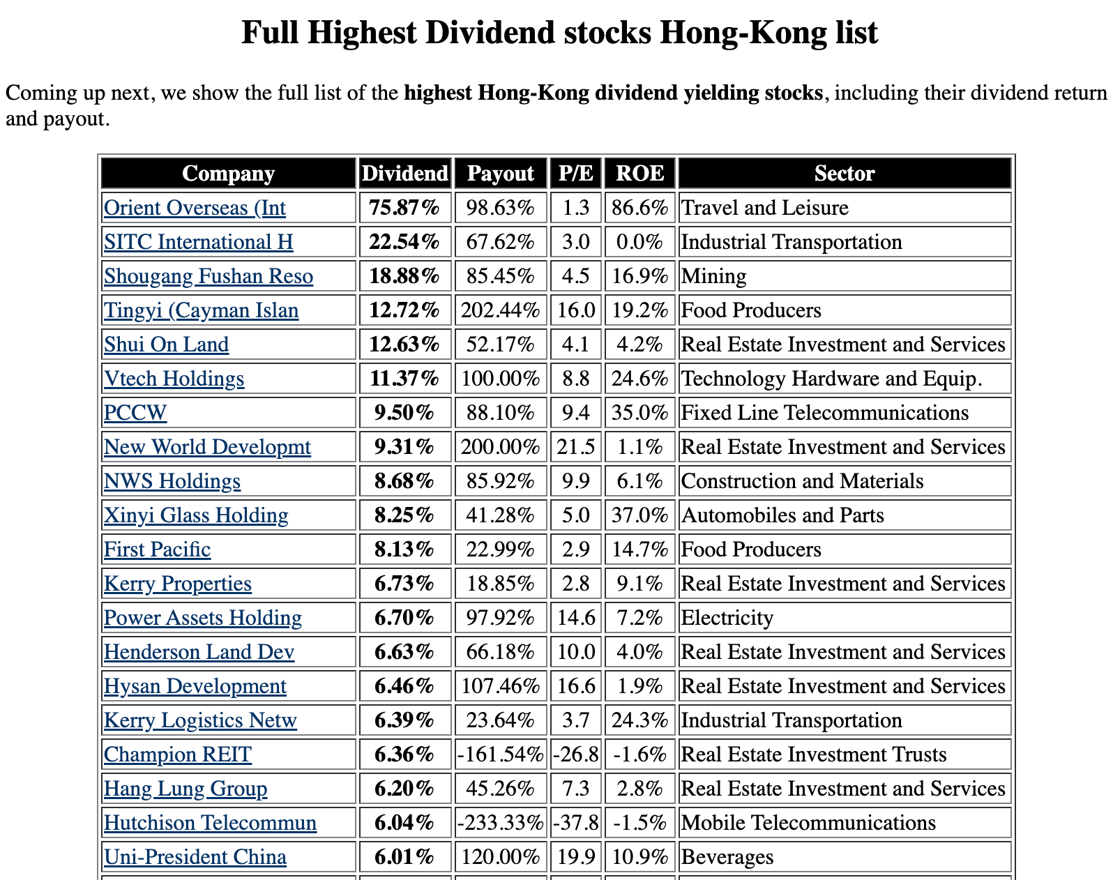 High Hong-Kong dividend stocks: Publicly traded companies ordered by their dividend yield ( 5.05% average)