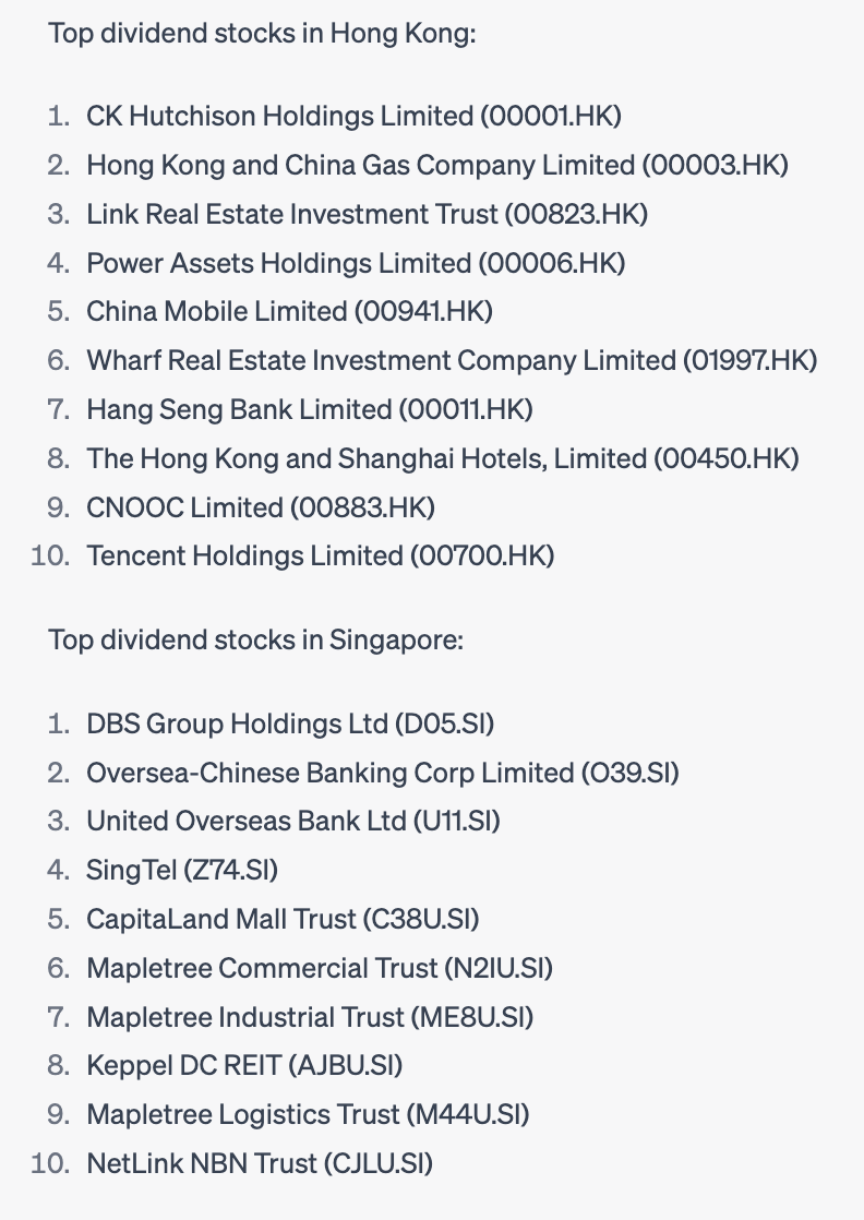 This is a list provided by ChatGPT for best dividend stocks in Hong Kong & Singapore: