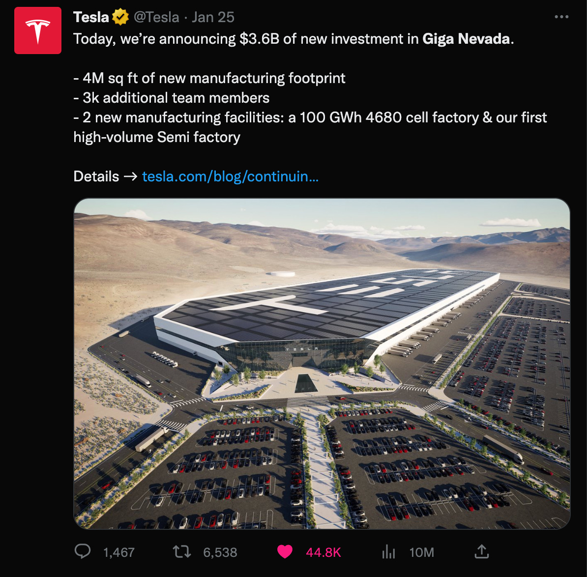 With the opening of the new Giga Nevada, we can also expect more savings, supply chain control and operational optimization. Some of the economies of scale gained can easily be shared with the customer. It is a gain for Tesla, an advantage to the customers and bad news for the competition.