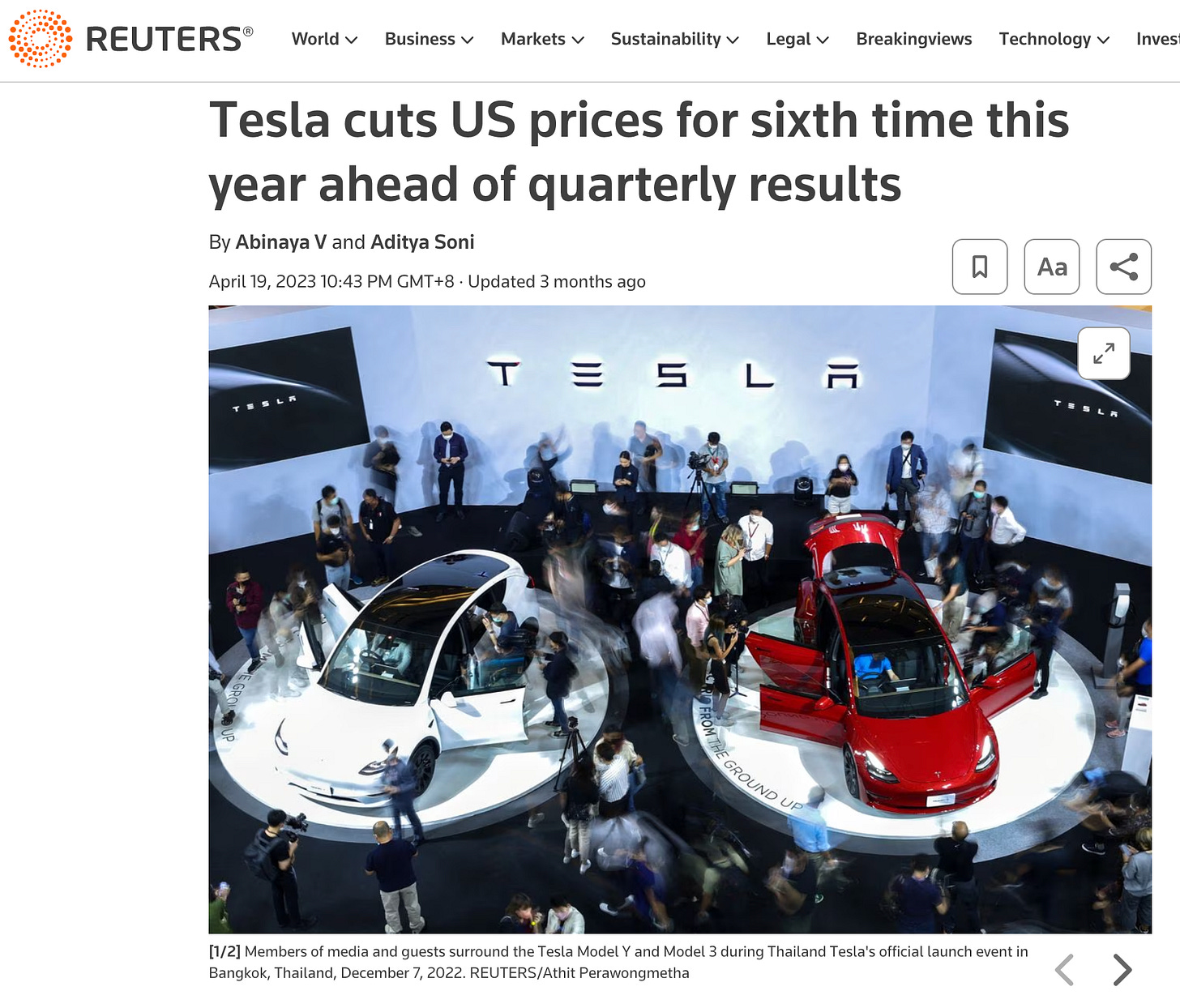 On 19 April 2023, Reuters cut US prices for the 6th time this year as per the news article above. It is interesting why Tesla would make this move when they can maintain the price to profit more.