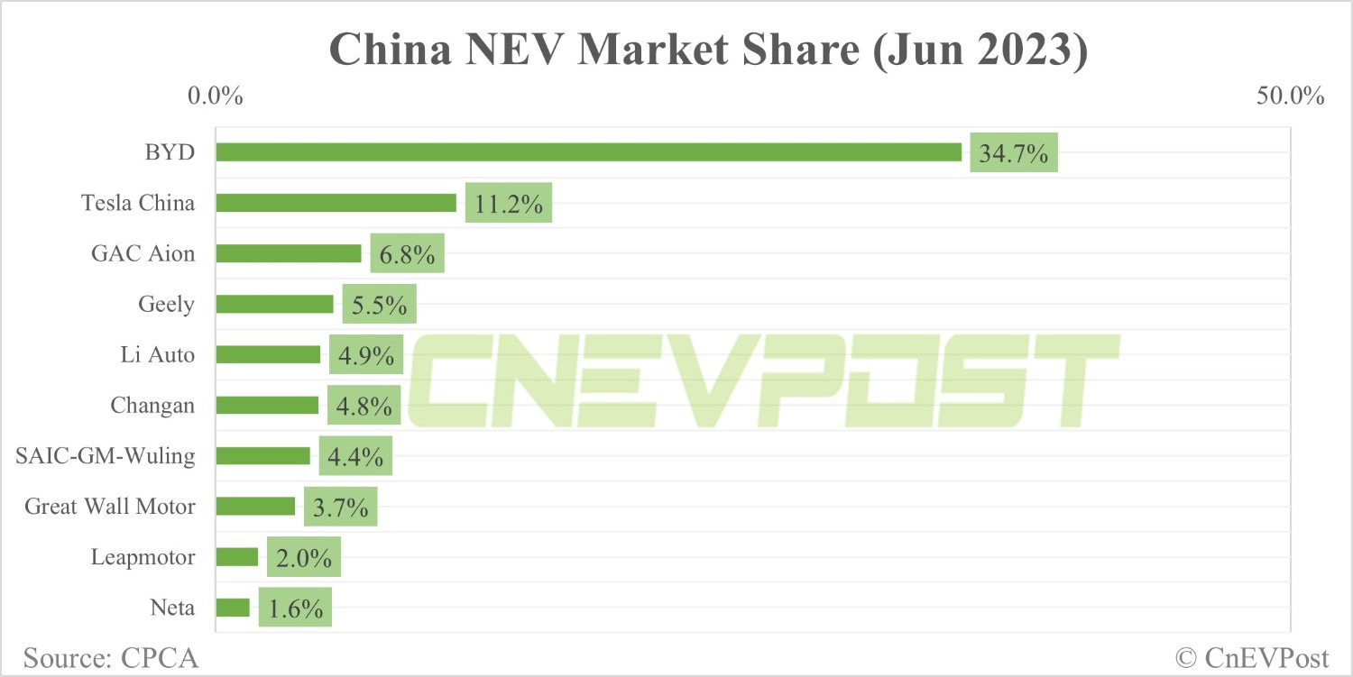 BYD continued to take the largest share of China's new energy vehicle (NEV) market with a big lead last month, with Tesla (NASDAQ: TSLA) in second place, according to a new ranking.