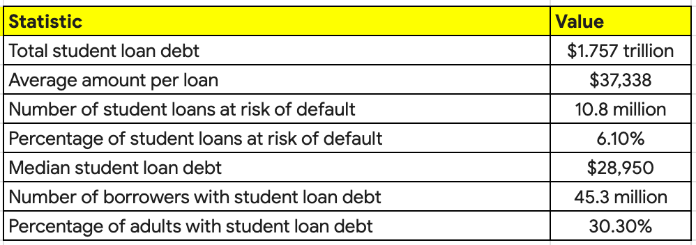 As of March 2023, the total student loan debt in the United States is $1.757 trillion. The average amount per loan is $37,338. The number of student loans at risk of default is estimated to be 10.8 million.