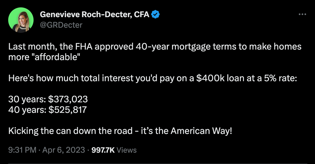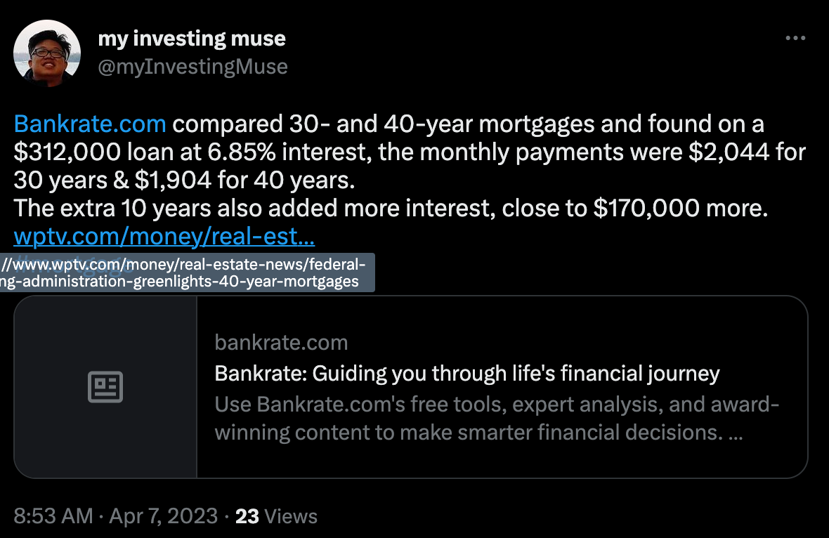 This is based on a $312,000 loan at an interest rate of 6.85%. The monthly payments amounted to $1,904 and $2,044 for 30 and 40-year mortgages respectively. The difference works out to be about $140 per month. This extension works out to be $170,000 extra being paid to stretch the mortgage by another 10 years.