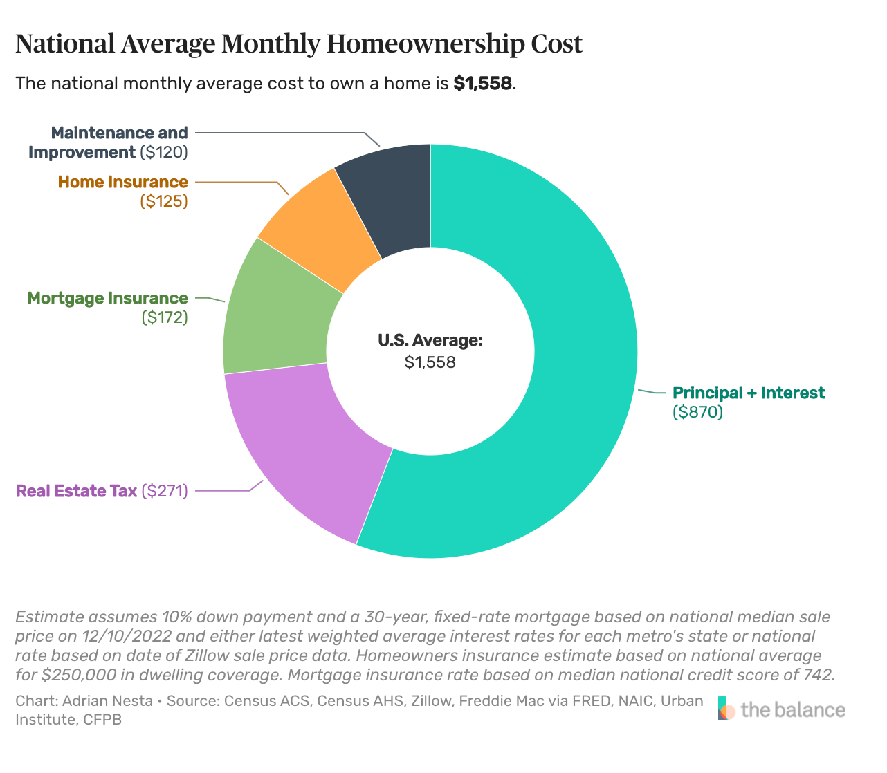 The national average monthly homeownership costs typically include maintenance and improvement, home insurance, mortgage insurance, real estate tax, and principal + interest payment.
