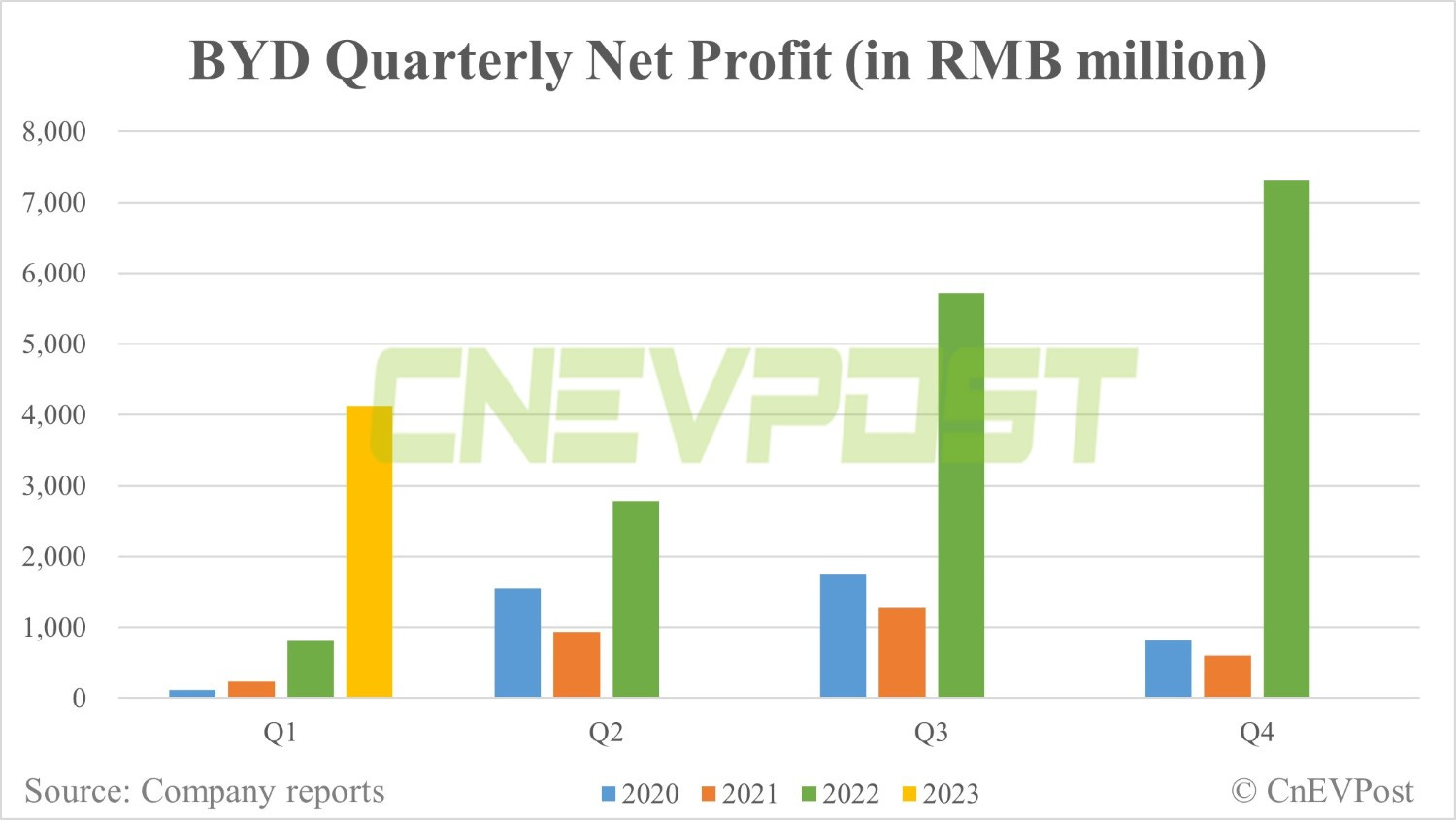 BYD's net profit for the quarter was RMB 4.13 billion, up 410.89 percent year-on-year, although it was 43.5 percent lower than in the fourth quarter of last year. After excluding non-recurring gains and losses, BYD's net profit in the first quarter was RMB 3.57 billion, up 593.68 percent year-on-year.