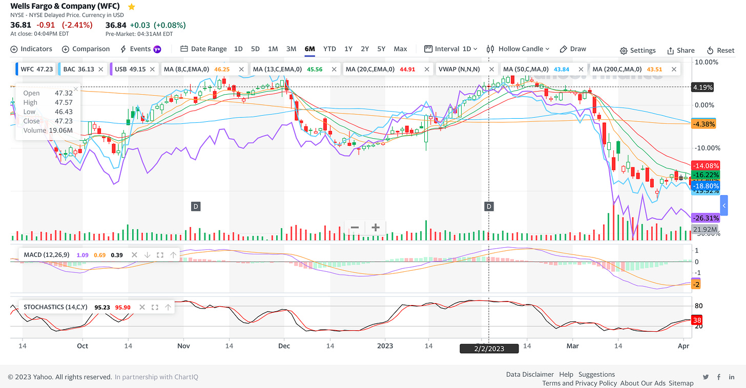 As per the 1D chart above, I have added BAC & USB to the 1D chart of WFC. We note the steep drop in the price of all 3 banks following the SVB & SBNY crisis. Their prices are ranging sideways.