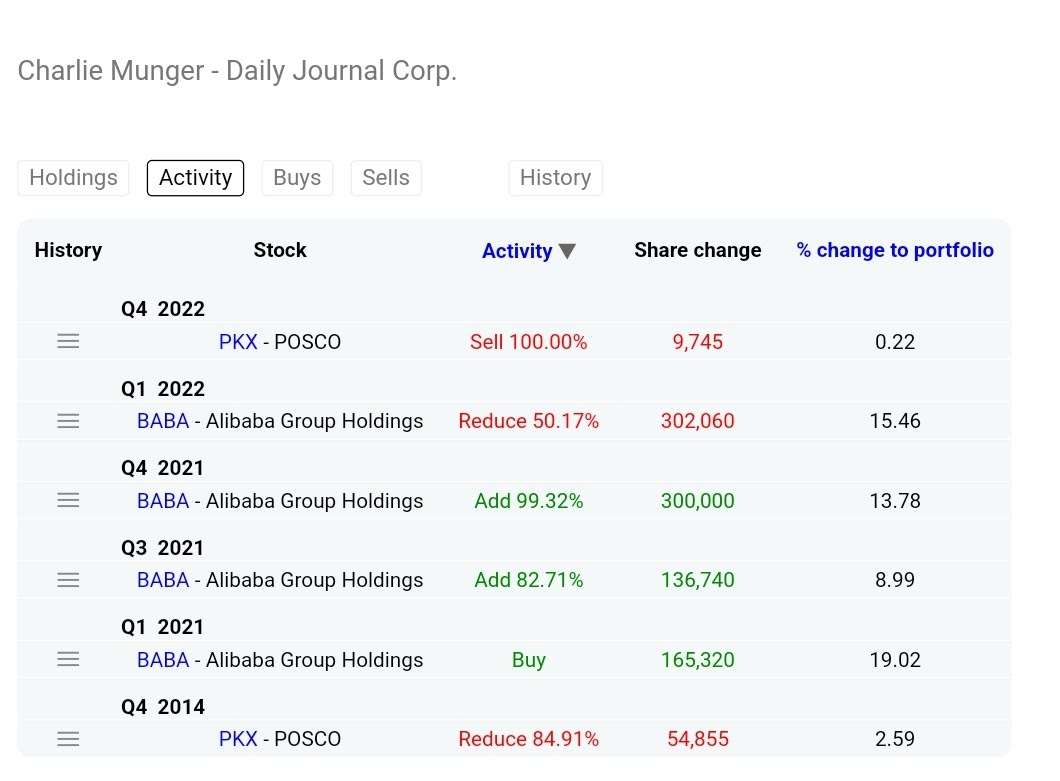 In the previous quarter (Q4/2022), Mr Munger sold off 100% of a small holding PKX - POSCO. Various ones are watching out for his holdings in Alibaba. Does this mean Alibaba is a safe investment now?