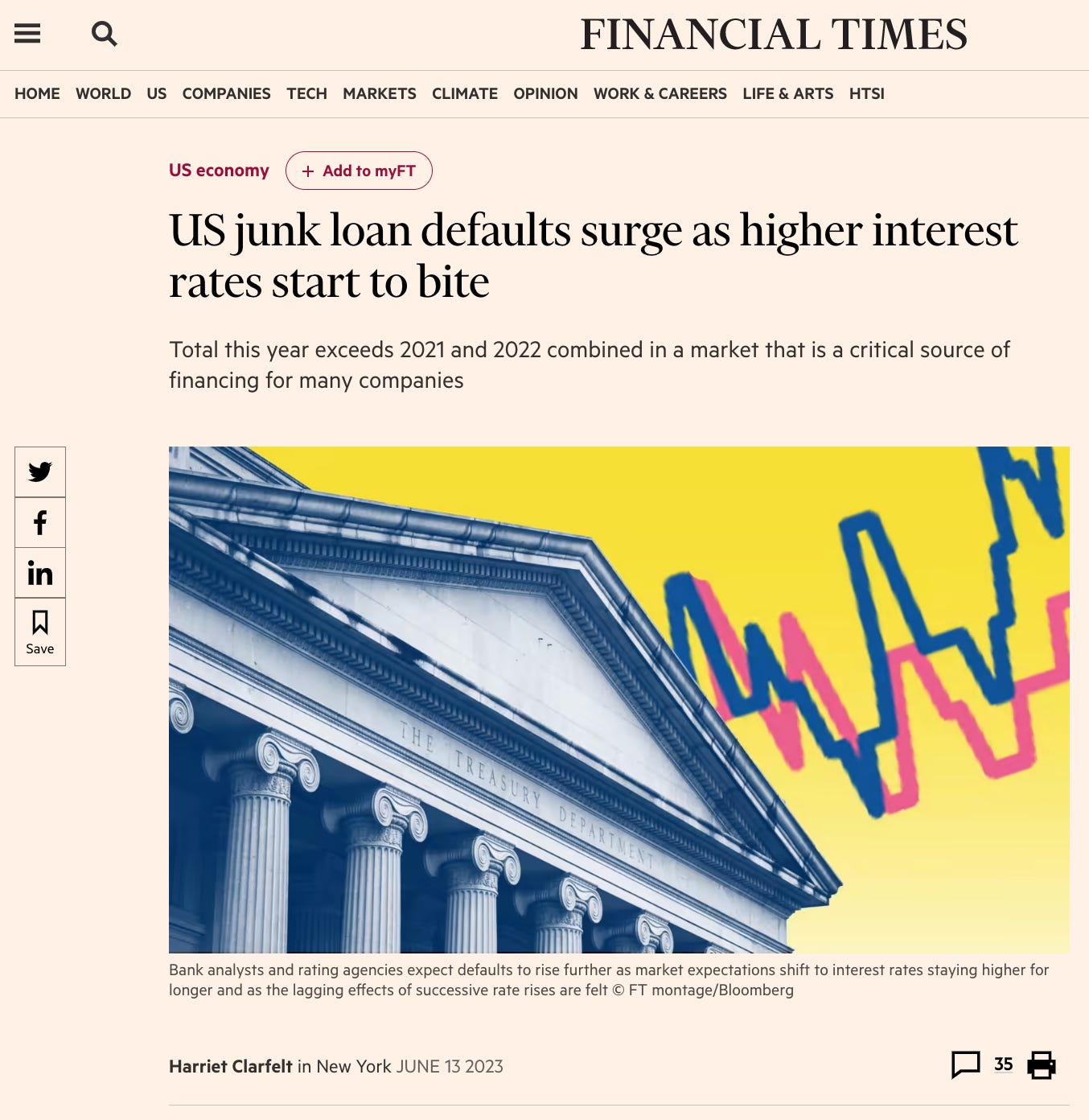 Defaults in the $1.4tn US junk loan market have climbed sharply this year as the Federal Reserve’s aggressive campaign of interest rate rises increases the pressure on risky companies with “floating” borrowing costs. There were 18 debt defaults in the US loan market between January 1 and the end of May totalling $21bn — greater in number and total value than for the whole of 2021 and 2022 combined, according to a Goldman Sachs analysis of data from PitchBook LCD.