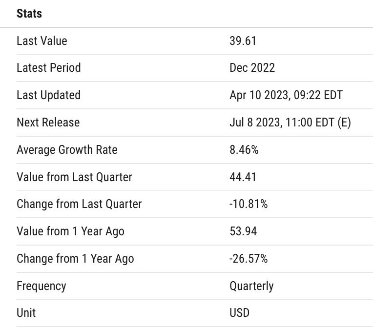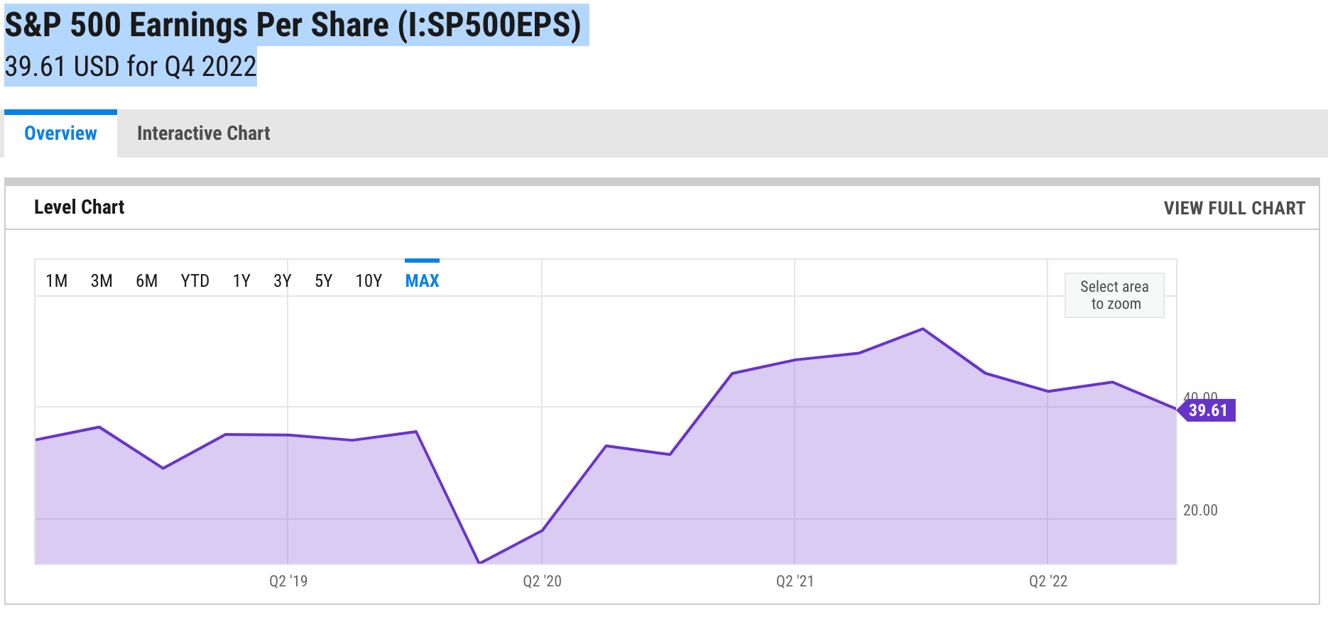 From the chart above, Q4/2022 sees S&P500 Earnings Per Share (I:SP500EPS) stand at USD39.61.