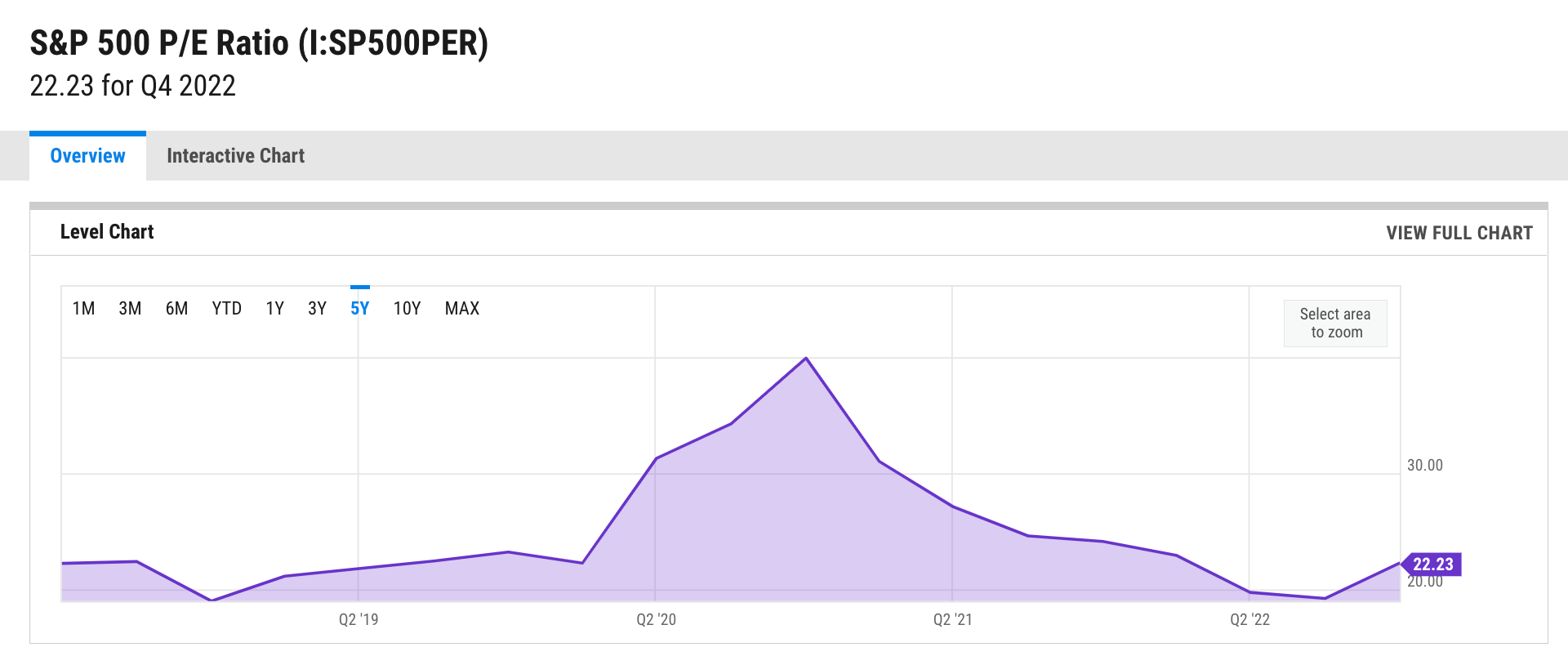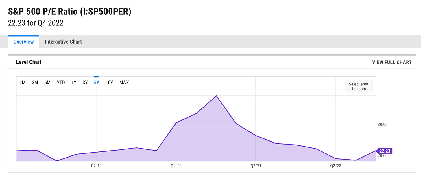 S&P 500 P/E Ratio is at a current level of 22.23, up from 19.17 last quarter and down from 24.09 one year ago. This is a change of 15.96% from last quarter and -7.73% from one year ago.