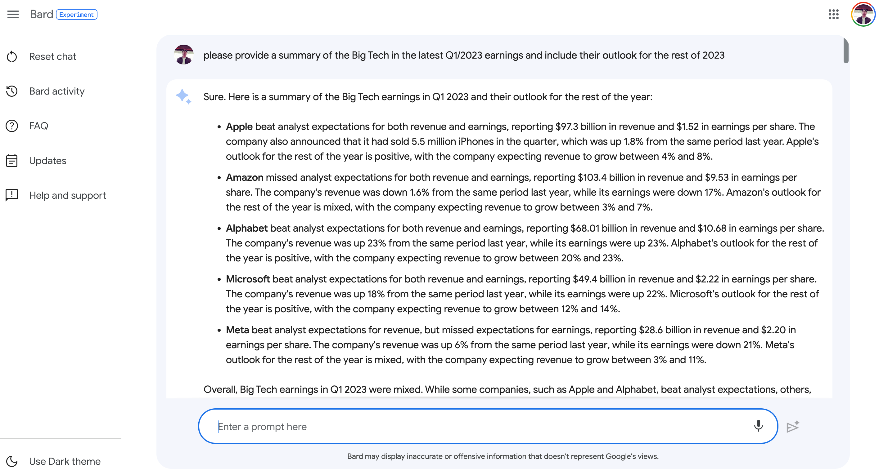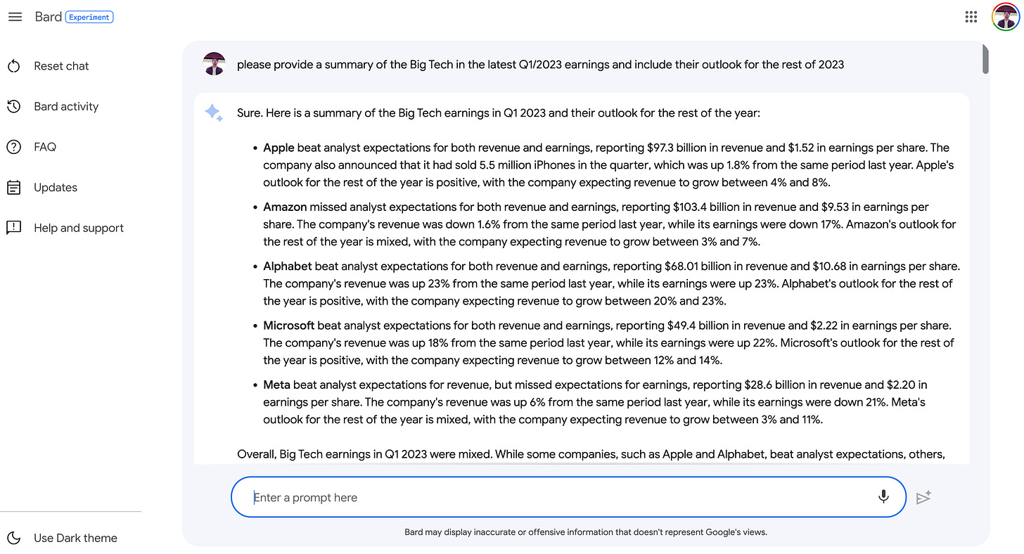 Can AI-powered investing beat human performance? With more learning, I would think that AI modelling would get more reliable over time after dealing with various abnormalities and outliers. One thing is for sure, it took Bard minutes to generate these answers and thus, I could spend more time analyzing and researching the topic. I have gained much productivity with this AI collaboration.