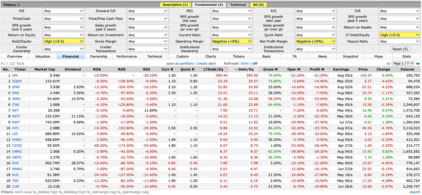 The results were sorted according to their Debt/Equity in descending order. The higher this number, the worse debt situation the company is in.