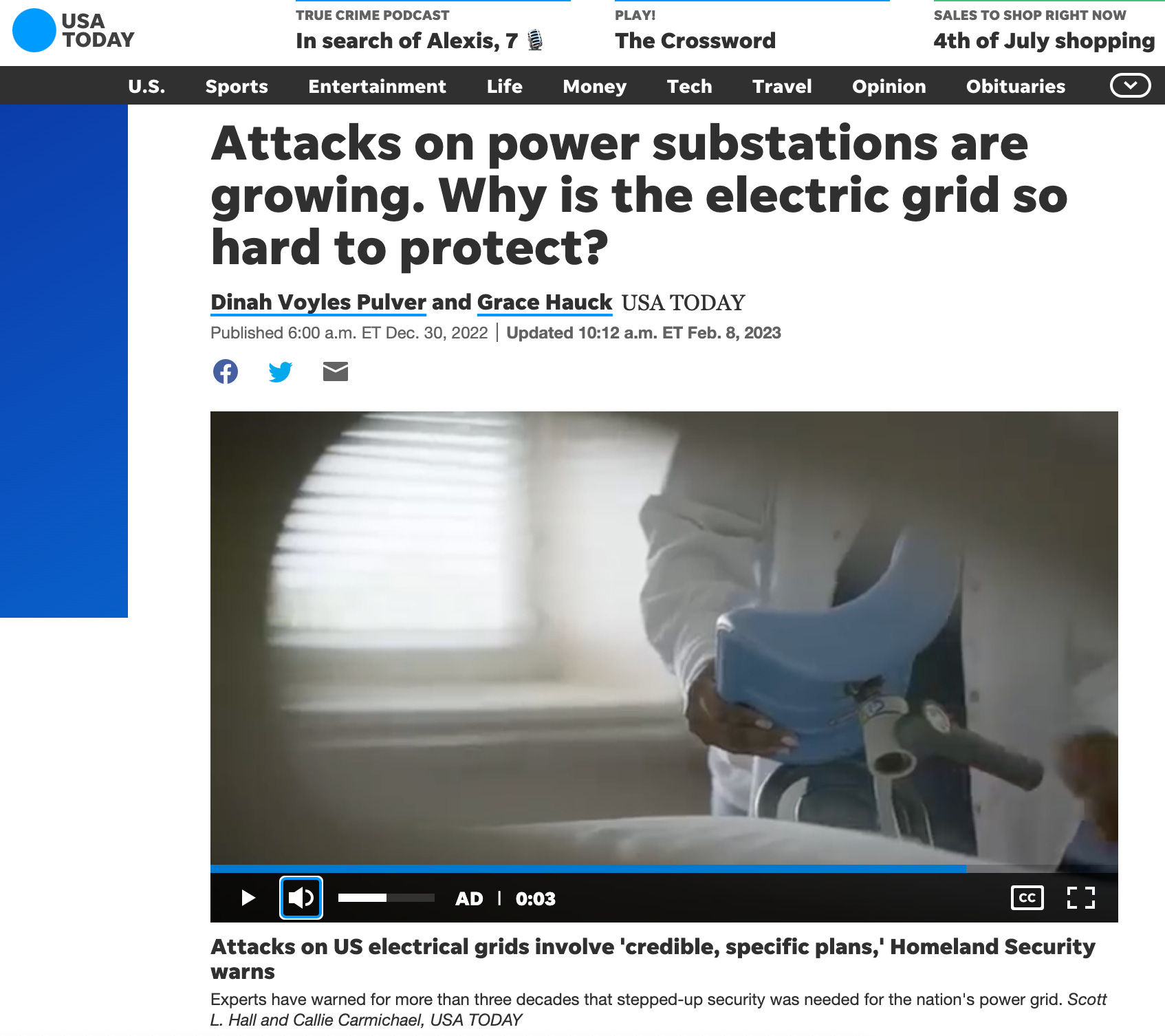 Recently, there were more attacks on power substations in the USA. Thus, there will also need to be more investment in the security of the infrastructure. Here are some news extracts from the USA Today article dated 30 Dec 2022: