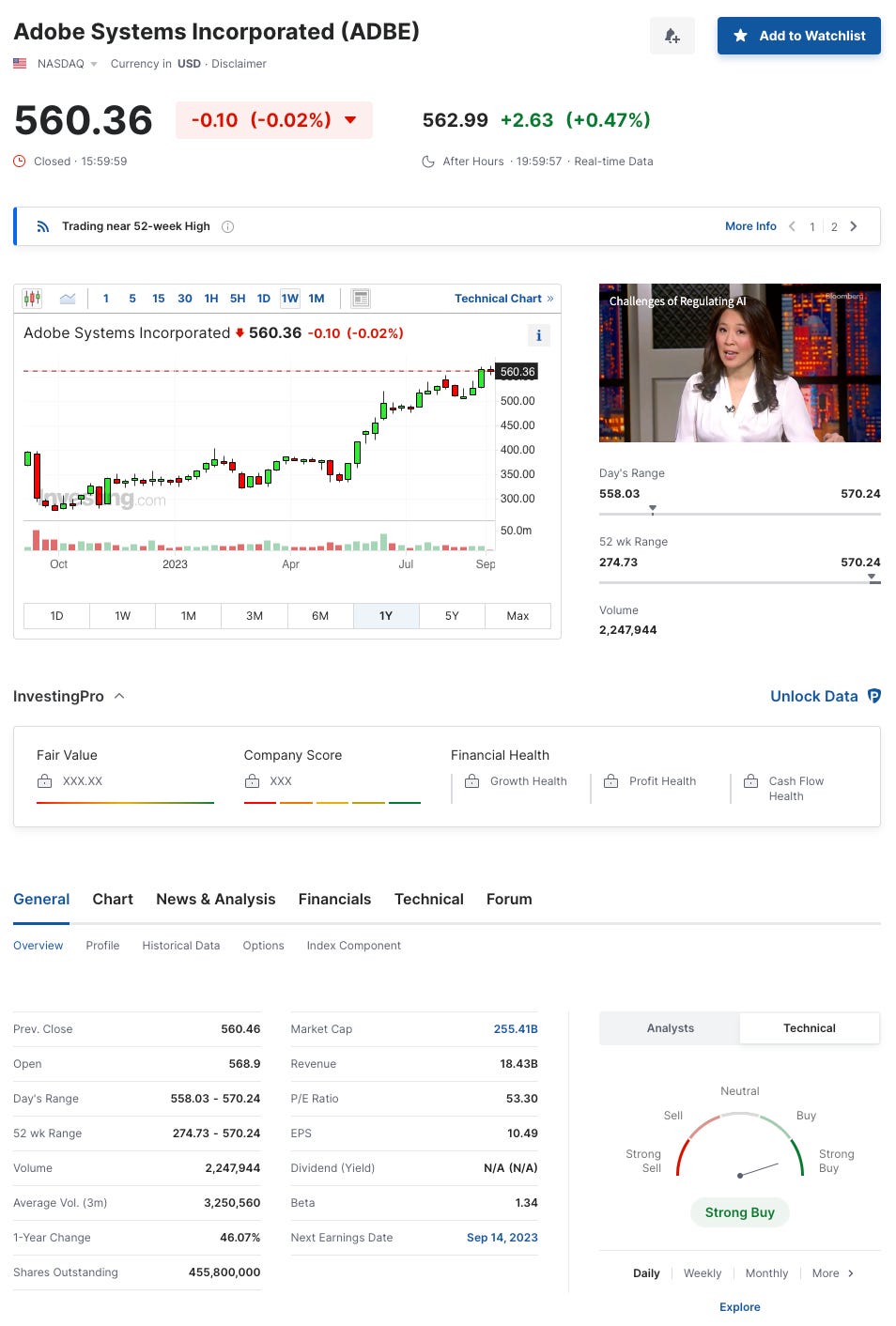 In the last year, Adobe’s stock has surged an impressive 46.07% and currently stands at a P/E ratio of 53.30 and EPS of 10.48.