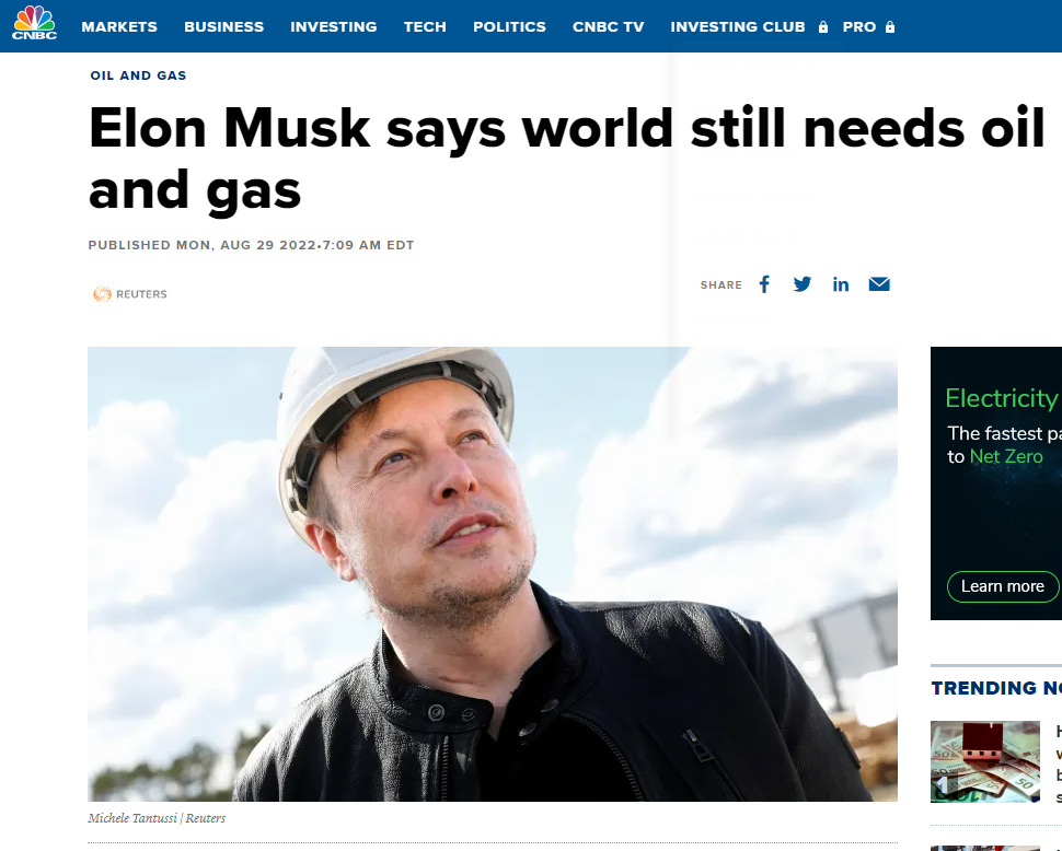 “Realistically I think we need to use oil and gas in the short term, because otherwise civilization will crumble,” Musk said on the sidelines of an energy conference in the southern city of Stavanger.