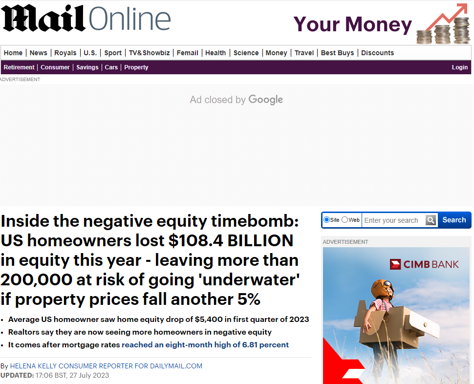 Average US homeowner saw home equity drop of $5,400 in first quarter of 2023