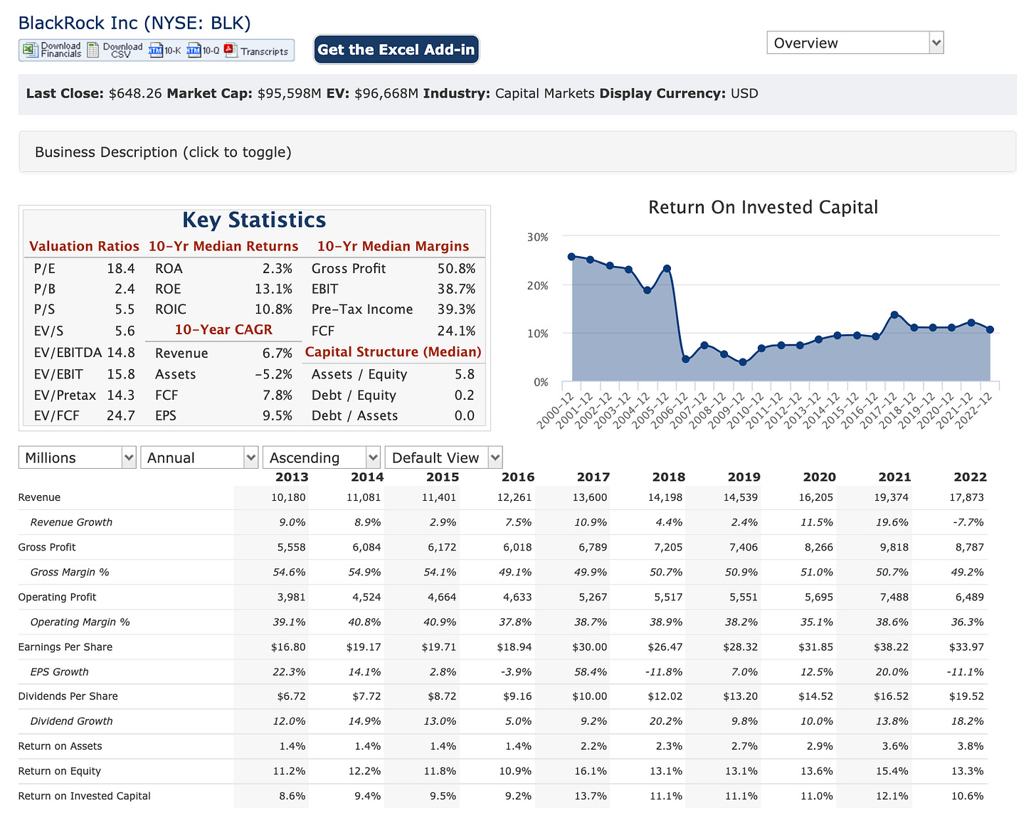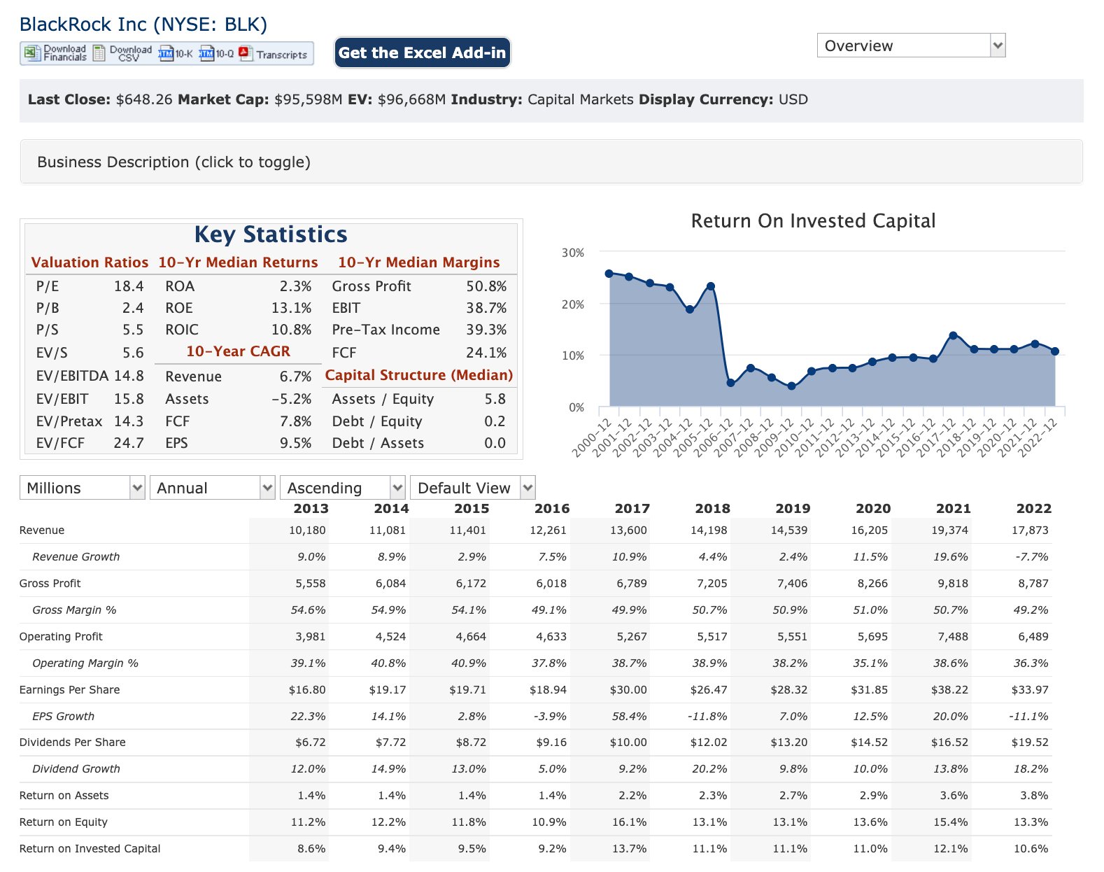 The above is the 10-year performance of BLK. It has an impressive 10-year median of 50.8% Gross Profit, 39.3% for pre-tax income and 24.1% FCF.