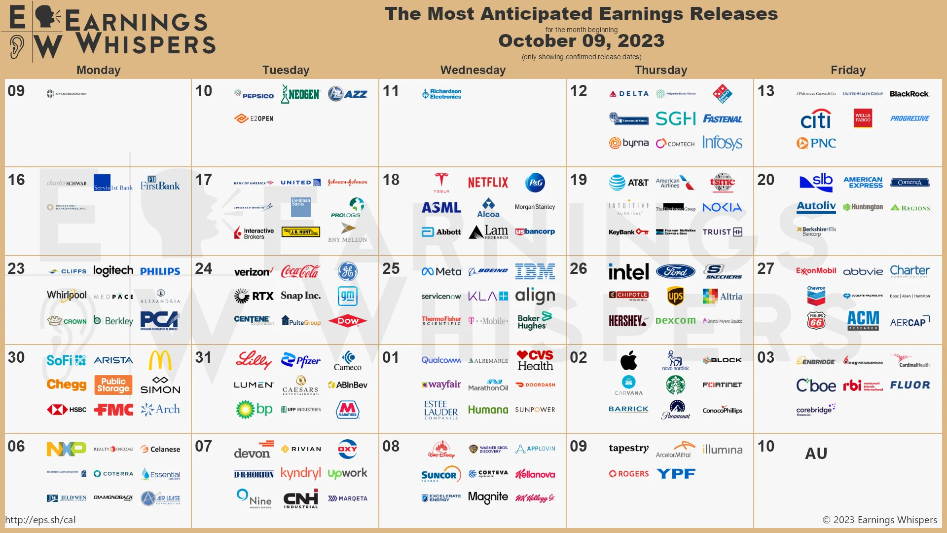 Preview of the week starting 09 Oct 2023 - earnings season starts with the banks