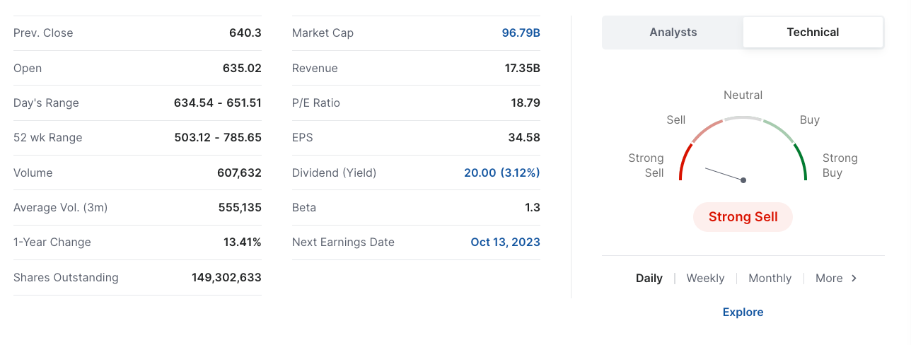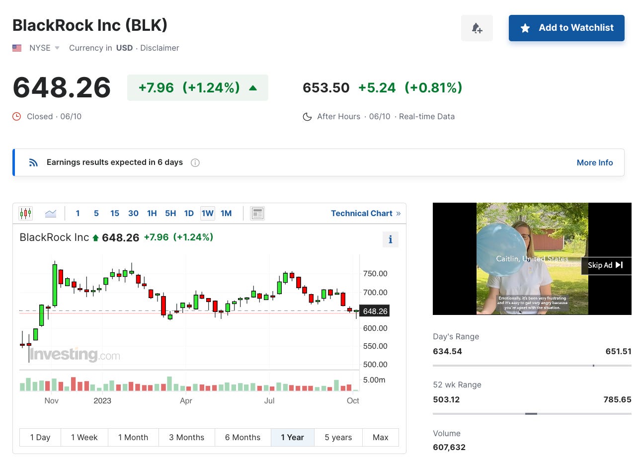 The above shows the 1-year performance of BLK and it was on a recent downtrend after hitting a 52-week high of 785.65.