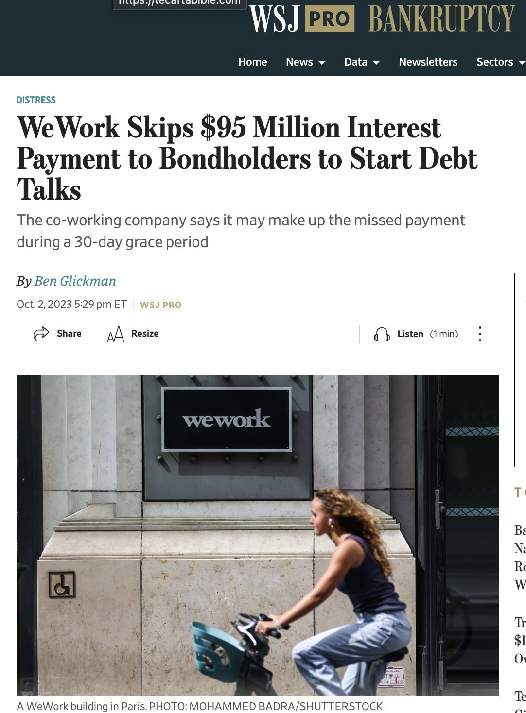 WSJ > The New York-based co-working company said in a regulatory filing Monday that it owed $37.3 million in cash and $57.9 million payable on payment-in-kind notes to lenders on various notes.