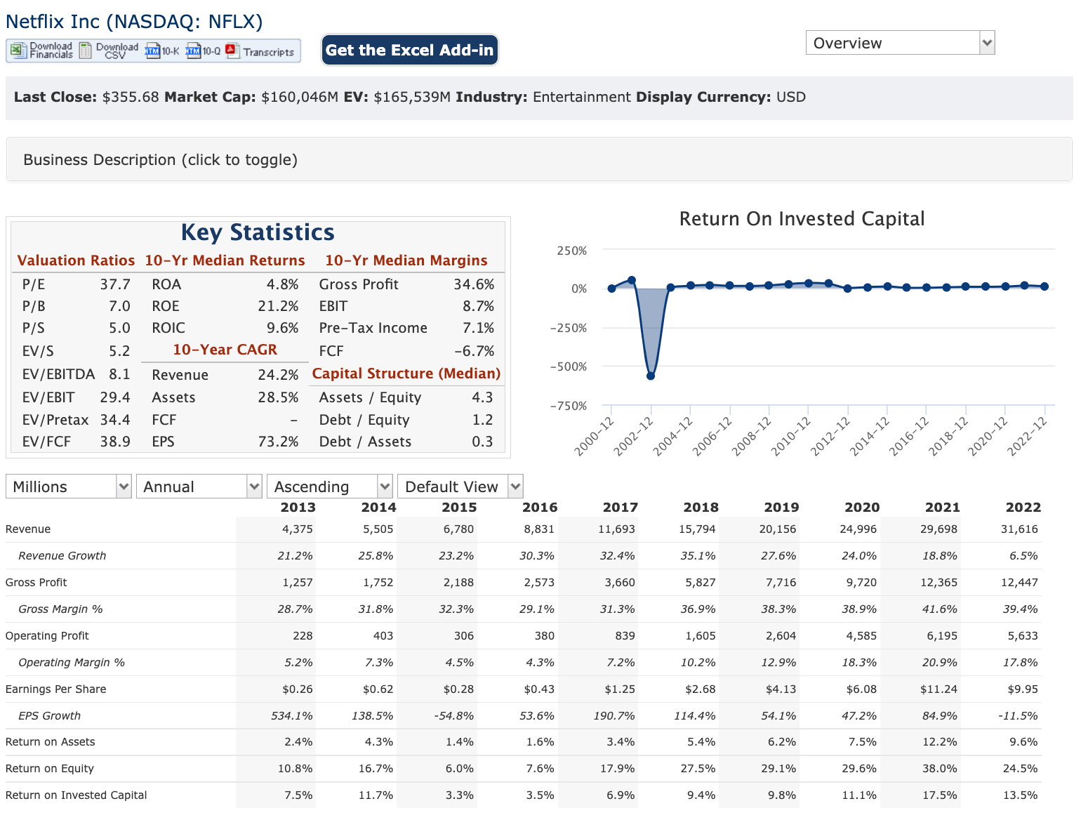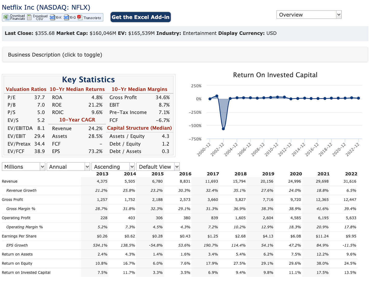 Revenue has grown from $4.375B (2013) to $31.616B (2022)