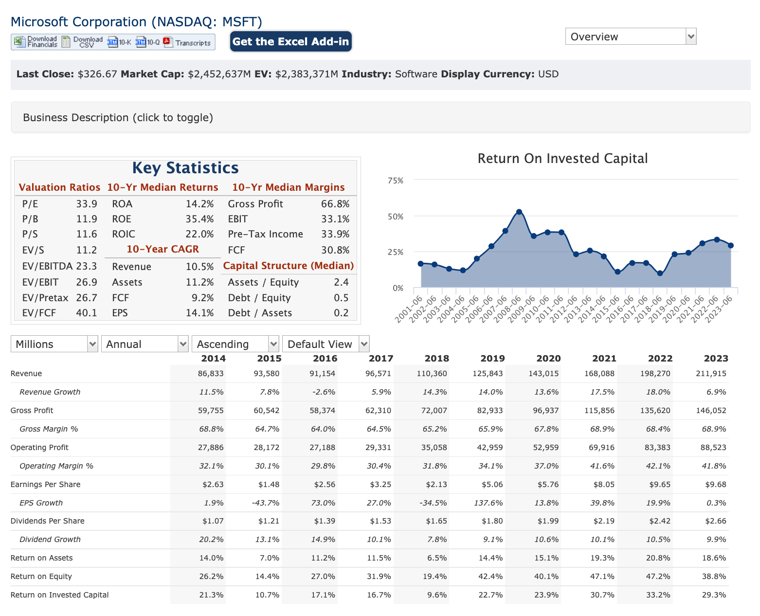 - Revenue has grown from $86B (2014) to $211B (2023)