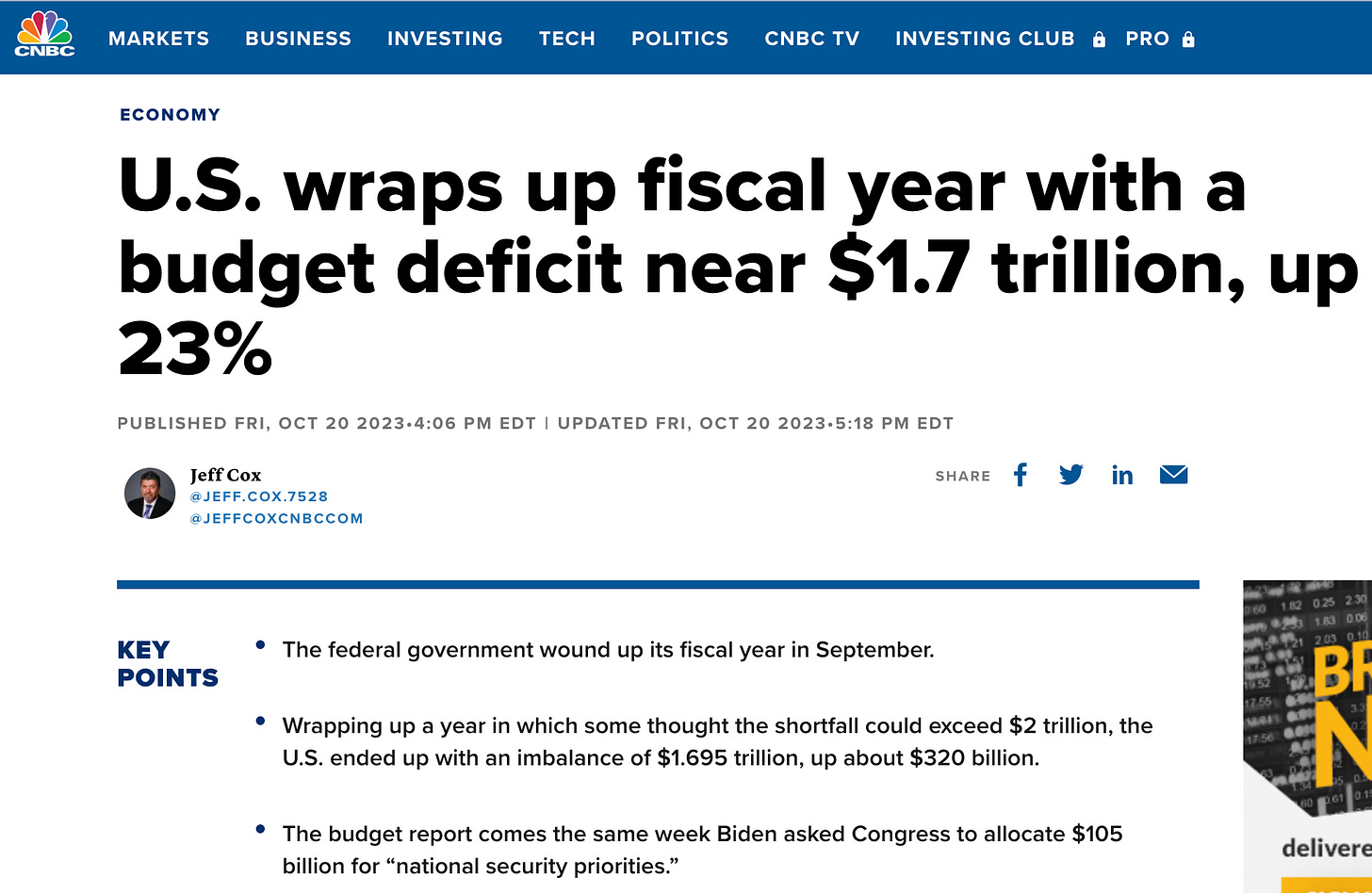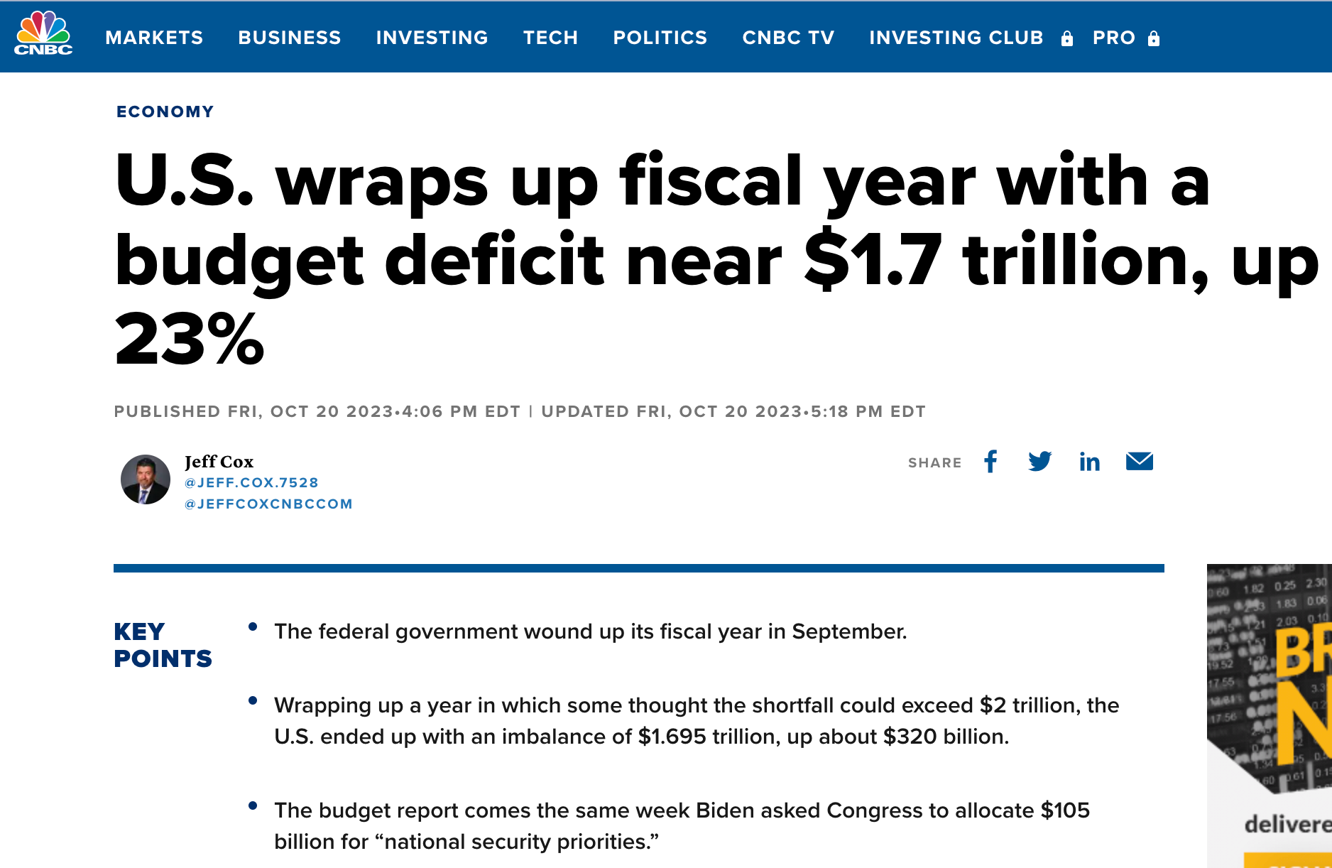 In the above CNBC article dated 20 Oct 23, the USA ended the fiscal year (ending on 30 September) with a deficit of nearly $1.7 trillion.